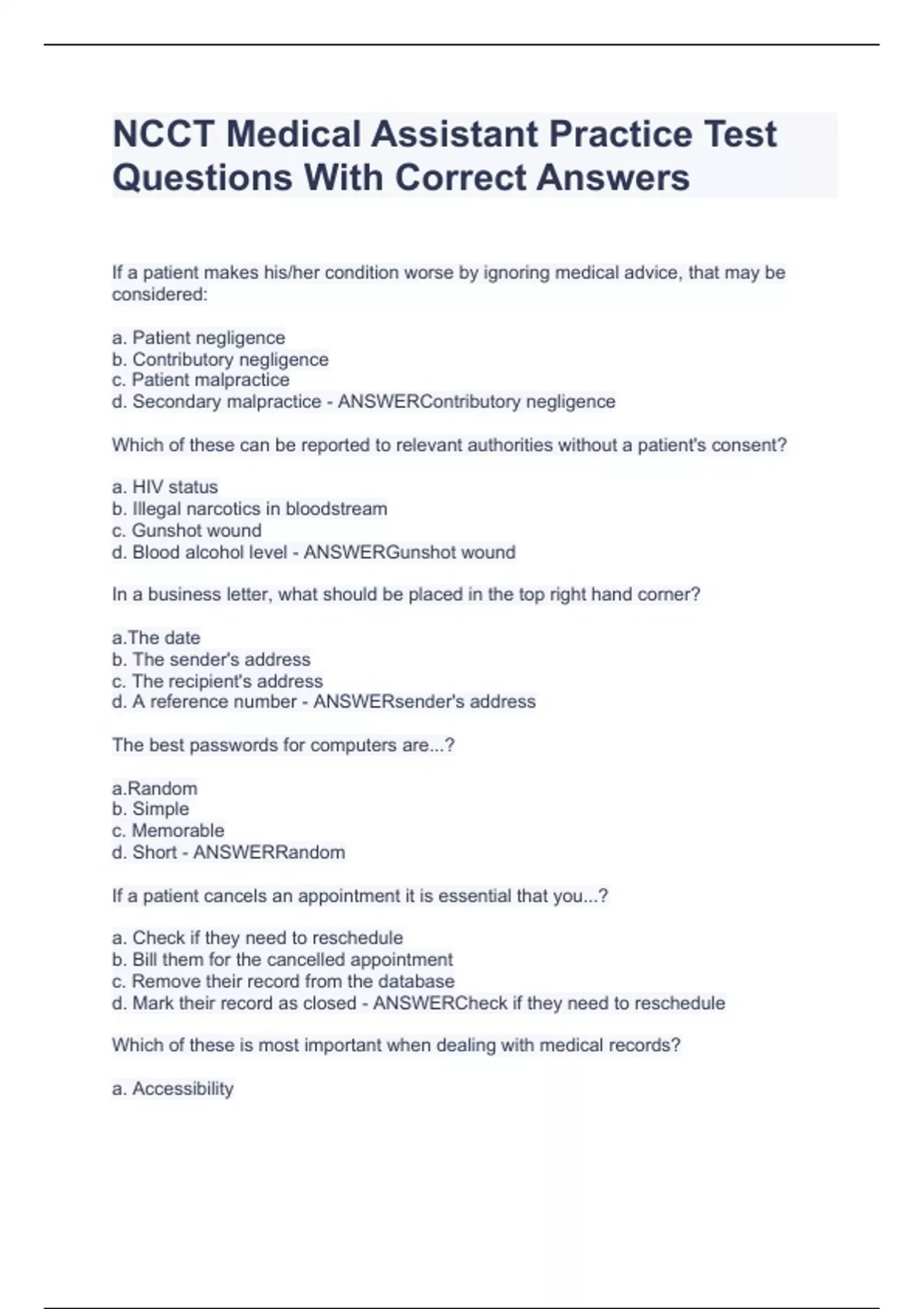 NCCT Medical Assistant Practice Test Questions With Correct AnswersNCCT Medical Assistant Practice Test Questions With Correct AnswersNCCT Medical Assistant Practice Test Questions With Correct Answers If a patient makes his/her condition worse by ignoring medical advice, that may be considered: a. Patient negligence b. Contributory negligence c. Patient malpractice d. Secondary malpractice - ANSWERContributory negligence Which of these can be reported to relevant authorities without a patient's consent? a. HIV status b. Illegal narcotics in bloodstream c. Gunshot wound d. Blood alcohol level - ANSWERGunshot wound In a business letter, what should be placed in the top right hand corner?