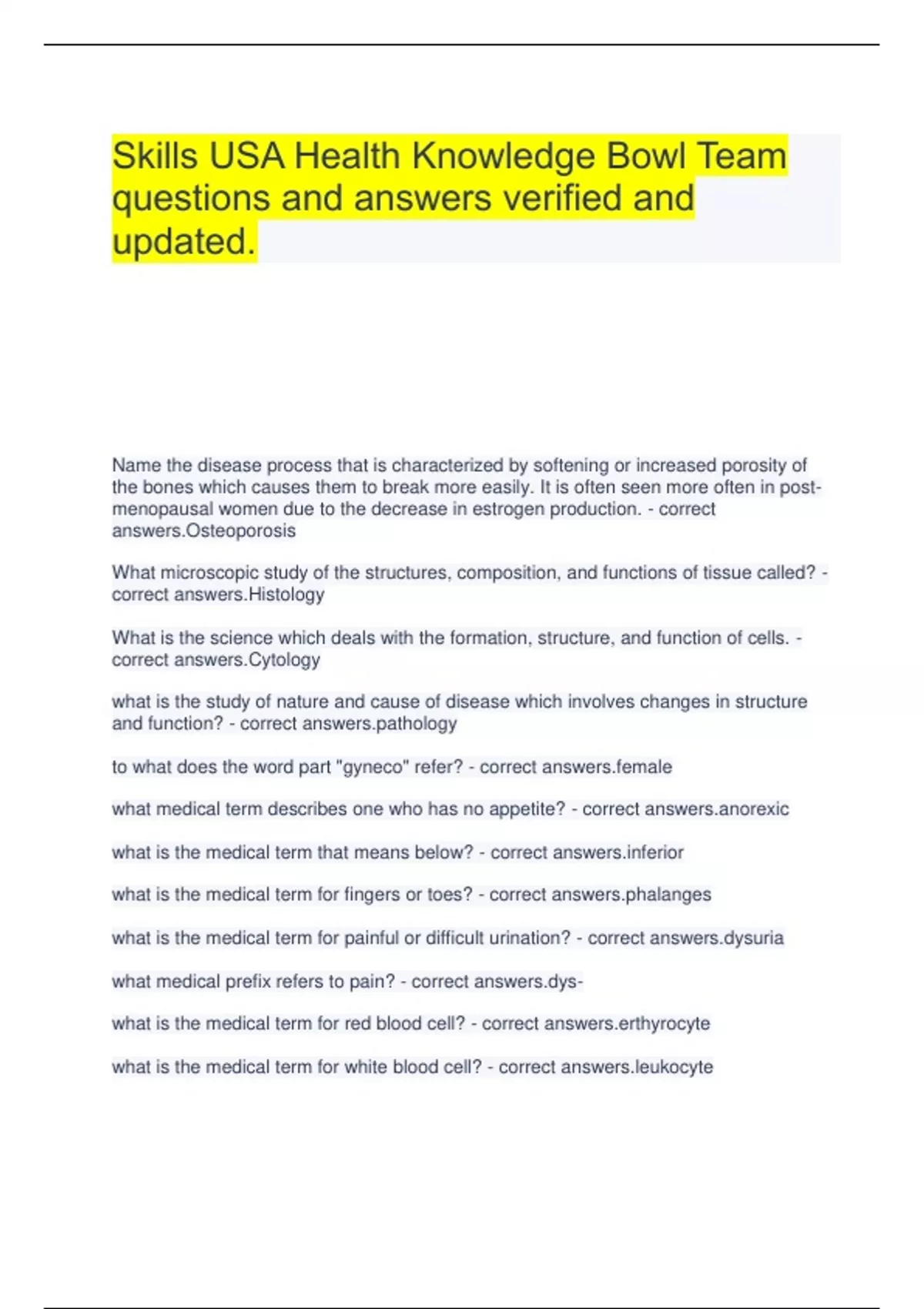 Skills USA Health Knowledge Bowl Team questions and answers verified and updated. Name the disease process that is characterized by softening or increased porosity of the bones which causes them to break more easily. It is often seen more often in post-menopausal women due to the decrease in estrogen production. - correct answers.Osteoporosis What microscopic study of the structures, composition, and functions of tissue called? - correct answers.Histology What is the science which deals with the formation, structure, and function of cells. - correct answers.Cytology what is the study of nature and cause of disease which involves changes in structure and function? - correct logy to what does the word part "gyneco" refer? - correct e what medical term describes one who has no appetite? - correct xic what is the medical term that means below? - correct ior what is the medical term for fingers or toes? - correct nges what is the medical term for painful or difficult urination? - correct ia what medical prefix refers to pain? - correct - what is the medical term for red blood cell? - correct rocyte what is the medical term for white blood cell? - correct cyte what is the medical term which means fibrin is destroyed? - correct nolysis what is the medical term that means hardening of the arteries? - correct iosclerosis what is the medical term indicating inflammation of a vein? - correct itis what is the medical term that means excessive vomiting? - correct emesis what is the medical prefix that means "too much"? - correct what is the medical term for a benign fatty tumor? - correct a what medical term means dissolving a stone? - correct lysis what is the medical term for a gallstone? - correct lith what is the medical term pertaining to the tongues and throat? - correct opharyngeal hemorrhage - correct is the medical term for profuse bleeding? what is the correct term for excessive amounts of urine? - correct ria what is the term used to mean the number of calories of heat that must be produced per hour to keep the baby alive, awake, and comfortably warm? - correct metabolic rate what is the correct term for no production of urine? - correct a what is the correct term for high blood sugar? - correct glycemia what is the correct term for sugar in the urine? - correct suria what is the term for low blood sugar? - correct lycemia what is the proper term for blood vessels getting larger in diameter? - correct ilation what is the medical term for profuse sweating? - correct oresis what is ABG the abbreviation for? - correct ial blood gases what does the abbreviation CT stand for? - correct ted tomography what does the abbreviation D/C mean? - correct ntinue what suffix refers to pain? - correct answers.-algia what is the abbreviation for iron? - correct answers.Fe what is FSH the abbreviation for? - correct cle stimulating hormone what is gtt the abbreviation for? - correct what is HCT the abbreviation for? - correct ocrit what is IVP the abbreviation for? - correct venous pyelogram what is the abbreviation meaning after meals? - correct what is the abbreviation meaning before meals? - correct what is the abbreviation meaning every other day? - correct what is the abbreviation mean every? - correct answers.q what is the abbreviation meaning "as needed" or "whenever necessary"? - correct what medical term means "immediately"? - correct what is the abbreviation for what is commonly referred to as a stroke? - correct answers.CVA what medical term means "as desired"? - correct lib what does the medical abbreviation "D&C" mean - correct ation and curettage What does the abbreviation h.s. mean? - correct answers.Hours of sleep Medical term for an ear ache? - correct ia Outside of the body - correct vitro Formal medical term for an umbilical hernia - correct locele Term for a pregnancy that occurs outside the uterine cavity - correct ic Name the female gonad - correct Name the cartilage associated with the larynx which bends over the laryngeal opening to direct food into the esophagus - correct answers.Epiglottis What is the first part of the small intestine called? - correct num What cranial nerve carries impulses for smell? - correct answers.Olfactory What are desired end products of carbohydrates digestion? - correct answers.Monosaccharides What is the anatomical term that indicates a structure nearer its origin? - correct answers.Proximal Cytoplasm - correct answers.What is the protoplasm inside the cell membrane called? Name three kinds of muscles and tell whether they are involuntary or voluntary - correct answers.Skeletal (Voluntary) Smooth (Involuntary) Cardiac (Involuntary) List three accessory organs of digestion - correct answers.Liver, Gallbladder, Pancreas Another name for the master gland? - correct answers.Pituitary Gland What muslce abducts the arm and caps the shoulders? - correct answers.Deltoid What is the kissing muscle of the lips called? - correct answers.Orbicular Oris What is the name of the longest vein in the body? - correct answers.Saphenous Name the three types of hormones that are produced in the adrenal cortex - correct answers.Glucocorticoids Mineralocorticoid Androgens What hormone stimulates "fight or flight" response in an emergency? - correct phrine How many cervical vertebrae are there in the vertebral column? - correct Name the outer membrane covering the brain and spinal cord - correct mater How many glasses of liquid should be consumed daily by an adult? - correct to eight Iron is a necessary component of what part of red blood cells? - correct answers.Hemoglobin