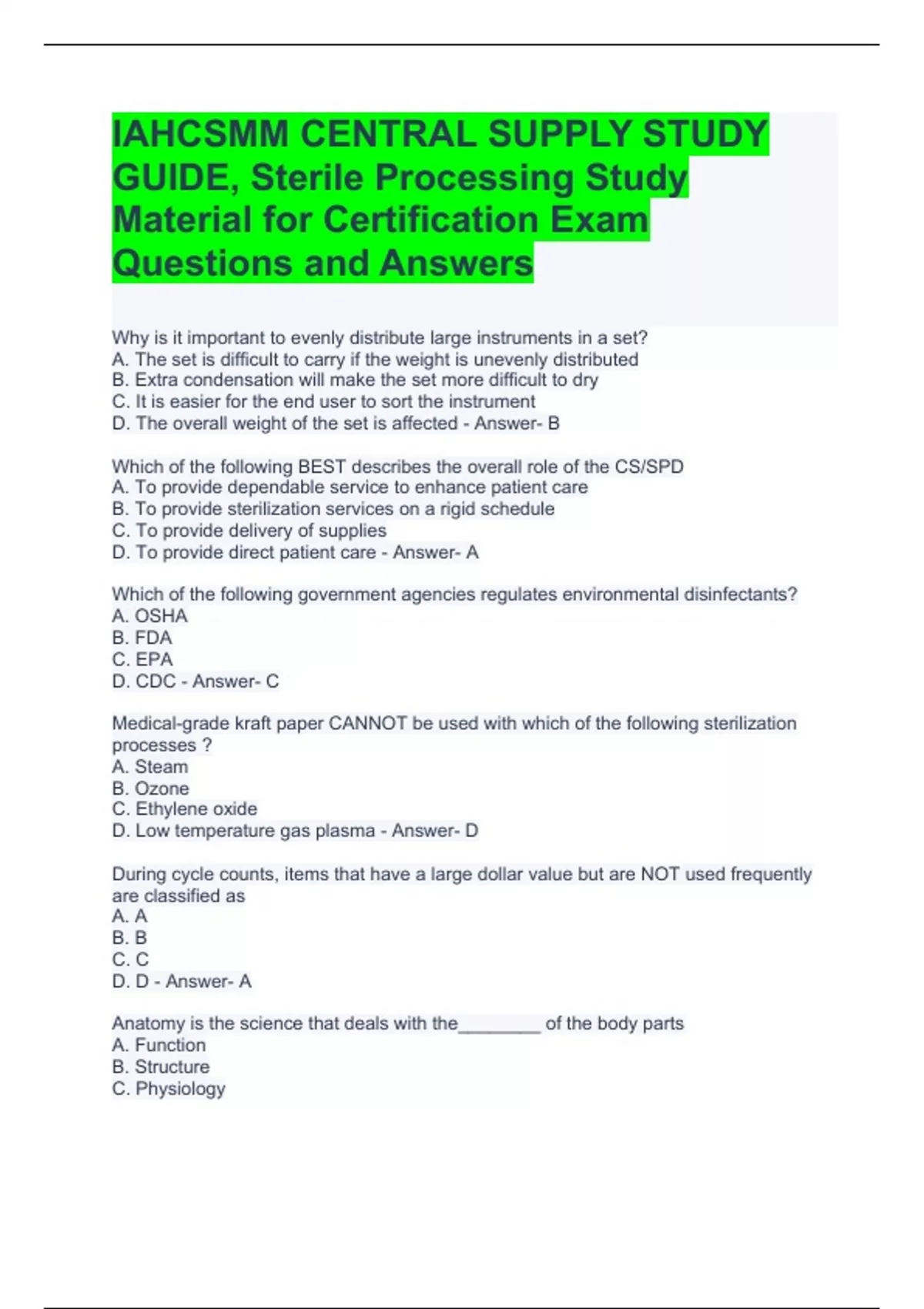 IAHCSMM CENTRAL SUPPLY STUDY GUIDE, Sterile Processing Study Material for Certification Exam Questions and Answers