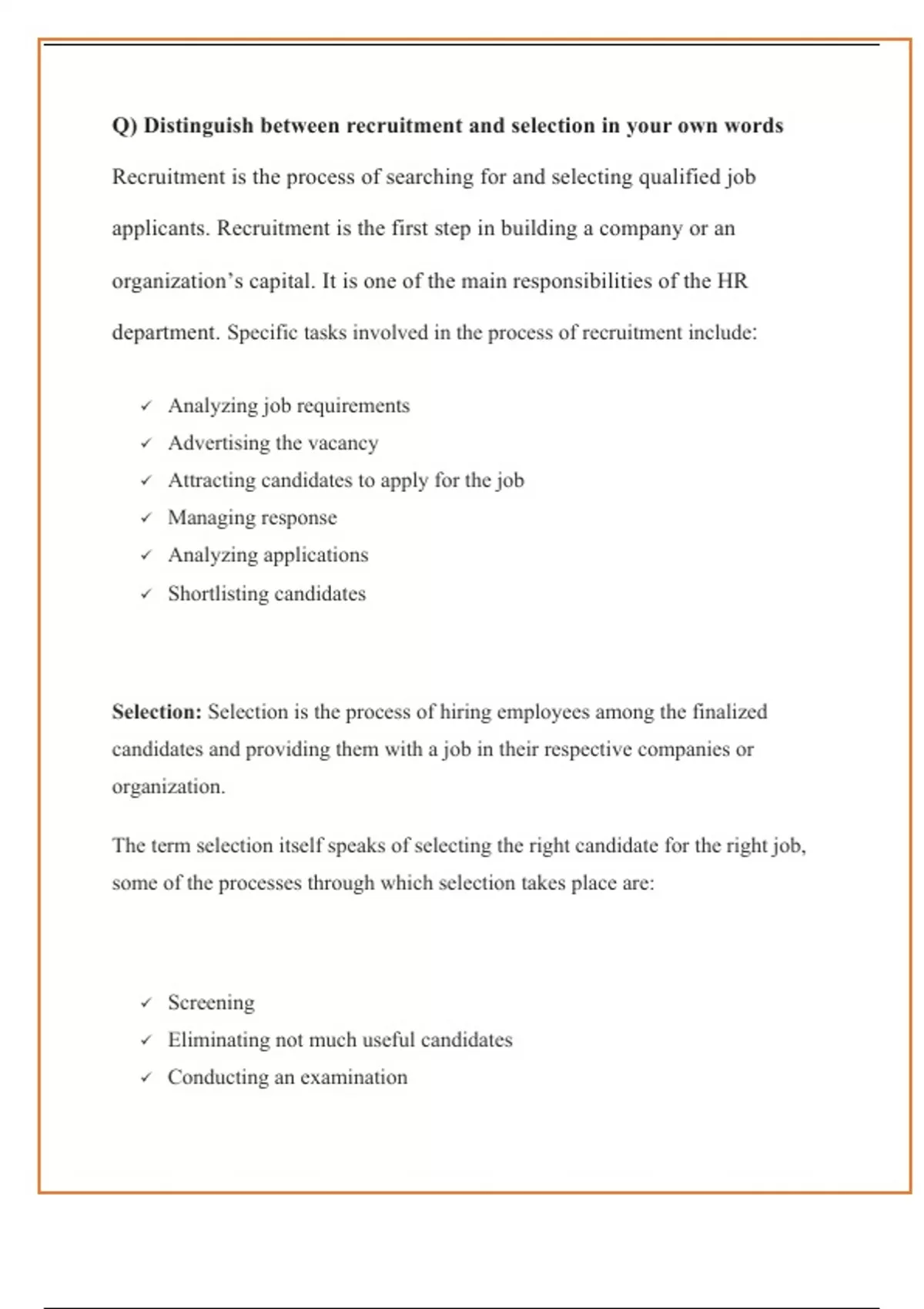 Q) Distinguish between recruitment and selection in your own words