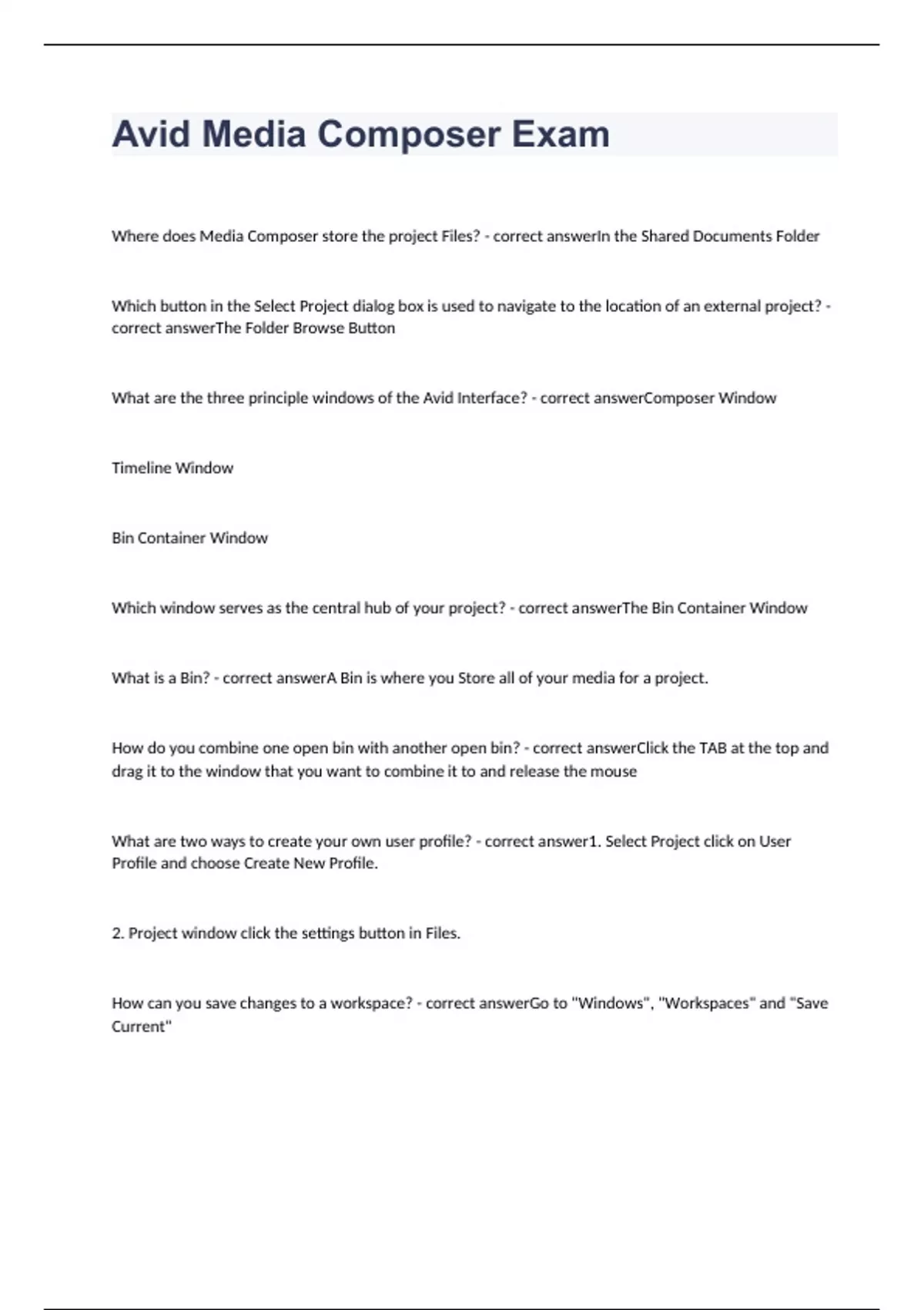 Where does Media Composer store the project Files? - correct answerIn the Shared Documents Folder Which button in the Select Project dialog box is used to navigate to the location of an external project? - correct answerThe Folder Browse Button What are the three principle windows of the Avid Interface? - correct answerComposer Window Timeline Window Bin Container Window Which window serves as the central hub of your project? - correct answerThe Bin Container Window What is a Bin? - correct answerA Bin is where you Store all of your media for a project. How do you combine one open bin with another open bin? - correct answerClick the TAB at the top and drag it to the window that you want to combine it to and release the mouse What are two ways to create your own user profile? - correct answer1. Select Project click on User Profile and choose Create New Profile. 2. Project window click the settings button in Files. How can you save changes to a workspace? - correct answerGo to "Windows", "Workspaces" and "Save Current"