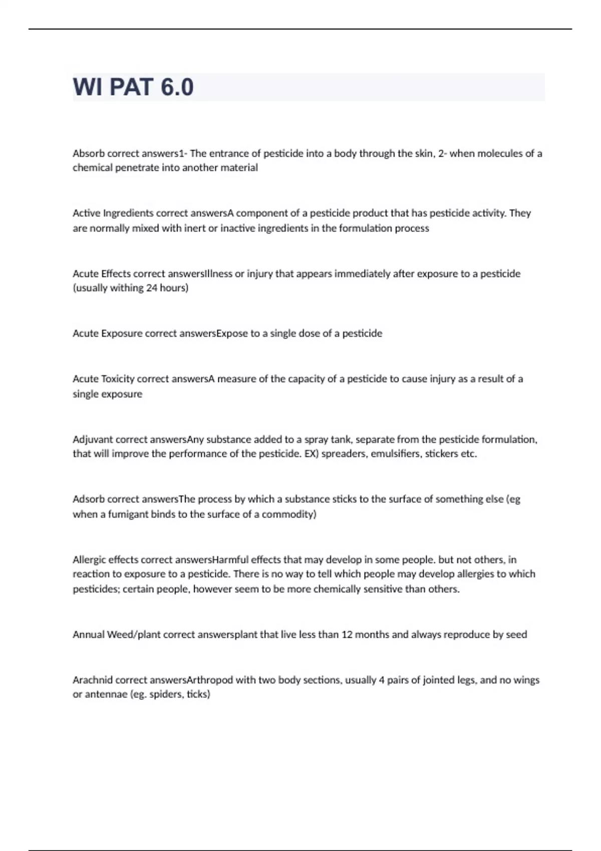 Absorb correct answers1- The entrance of pesticide into a body through the skin, 2- when molecules of a chemical penetrate into another material Active Ingredients correct answersA component of a pesticide product that has pesticide activity. They are normally mixed with inert or inactive ingredients in the formulation process Acute Effects correct answersIllness or injury that appears immediately after exposure to a pesticide (usually withing 24 hours) Acute Exposure correct answersExpose to a single dose of a pesticide Acute Toxicity correct answersA measure of the capacity of a pesticide to cause injury as a result of a single exposure Adjuvant correct answersAny substance added to a spray tank, separate from the pesticide formulation, that will improve the performance of the pesticide. EX) spreaders, emulsifiers, stickers etc. Adsorb correct answersThe process by which a substance sticks to the surface of something else (eg when a fumigant binds to the surface of a commodity) Allergic effects correct answersHarmful effects that may develop in some people. but not others, in reaction to exposure to a pesticide. There is no way to tell which people may develop allergies to which pesticides; certain people, however seem to be more chemically sensitive than others. Annual Weed/plant correct answersplant that live less than 12 months and always reproduce by seed Arachnid correct answersArthropod with two body sections, usually 4 pairs of jointed legs, and no wings or antennae (eg. spiders, ticks)