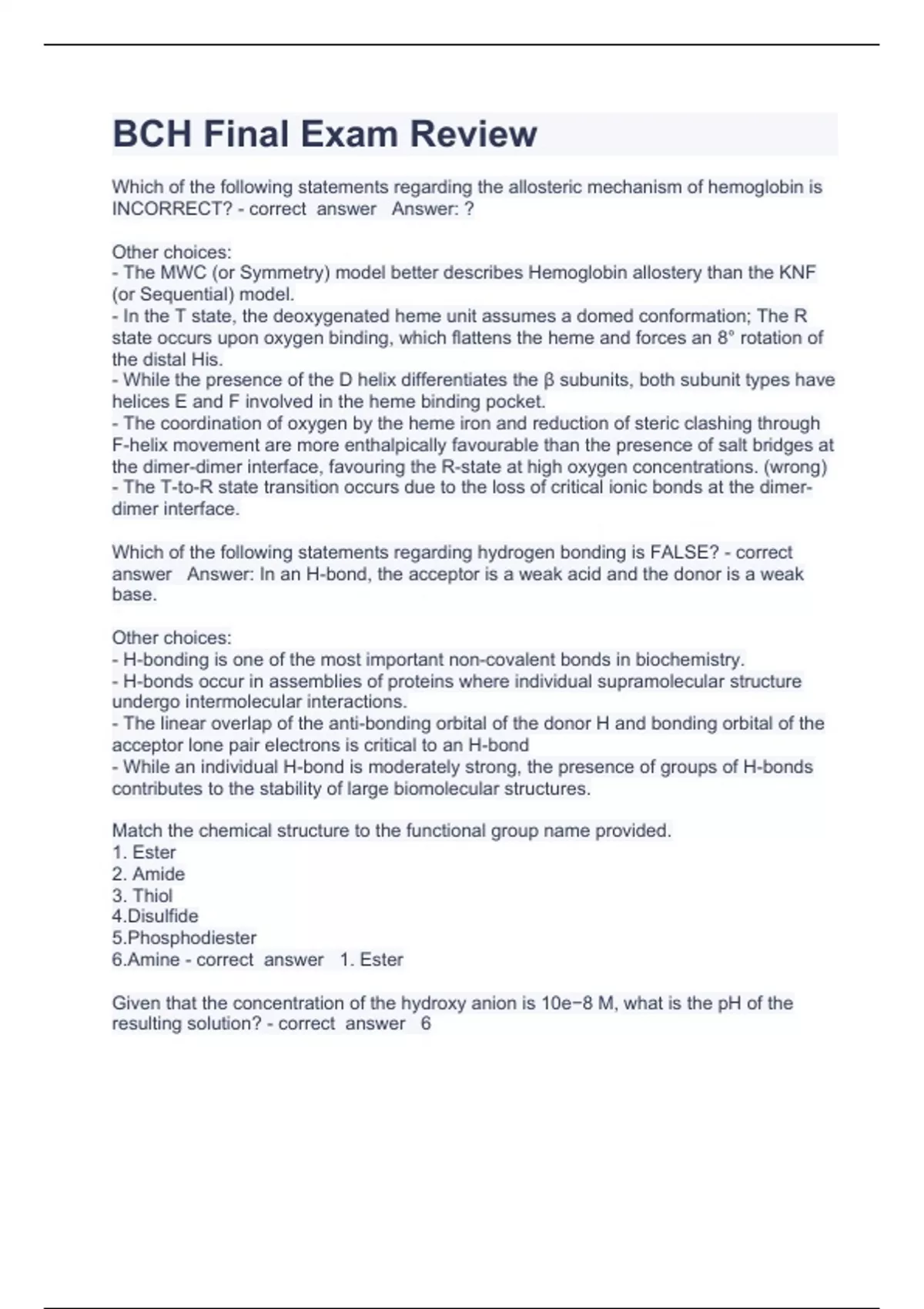 bch final exam review questions with complete solu