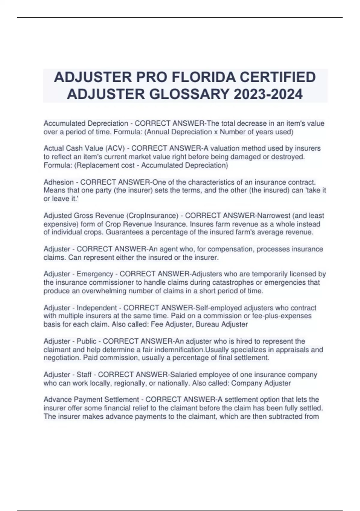ADJUSTER PRO FLORIDA CERTIFIED ADJUSTER GLOSSARY Accumulated Depreciation - CORRECT ANSWER-The total decrease in an item's value over a period of time. Formula: (Annual Depreciation x Number of years used) Actual Cash Value (ACV) - CORRECT ANSWER-A valuation method used by insurers to reflect an item's current market value right before being damaged or destroyed. Formula: (Replacement cost - Accumulated Depreciation) Adhesion - CORRECT ANSWER-One of the characteristics of an insurance contract. Means that one party (the insurer) sets the terms, and the other (the insured) can 'take it or leave it.' Adjusted Gross Revenue (CropInsurance) - CORRECT ANSWER-Narrowest (and least expensive) form of Crop Revenue Insurance. Insures farm revenue as a whole instead of individual crops. Guarantees a percentage of the insured farm's average revenue. Adjuster - CORRECT ANSWER-An agent who, for compensation, processes insurance claims. Can represent either the insured or the insurer. Adjuster - Emergency - CORRECT ANSWER-Adjusters who are temporarily licensed by the insurance commissioner to handle claims during catastrophes or emergencies that produce an overwhelming number of claims in a short period of time. Adjuster - Independent - CORRECT ANSWER-Self-employed adjusters who contract with multiple insurers at the same time. Paid on a commission or fee-plus-expenses basis for each claim. Also called: Fee Adjuster, Bureau Adjuster Adjuster - Public - CORRECT ANSWER-An adjuster who is hired to represent the claimant and help determine a fair indemnification.Usually specializes in appraisals and negotiation. Paid commission, usually a percentage of final settlement. Adjuster - Staff - CORRECT ANSWER-Salaried employee of one insurance company who can work locally, regionally, or nationally. Also called: Company Adjuster Advance Payment Settlement - CORRECT ANSWER-A settlement option that lets the insurer offer some financial relief to the claimant before the claim has been fully settled. The insurer makes advance payments to the claimant, which are then subtracted from the final settlement amount. Often used when a claimant suffers bodily injury and is unable to work. Agency Authority - CORRECT ANSWER-The Agent's authority to act on behalf of someone else, usually an insurer. This authority is derived from the agent's contract with the insurer. Agency Authority - express - CORRECT ANSWER-Authority that is expressly given to the agent in writing. Allows agent to act on behalf of the principal. Aency Authority - implied - CORRECT ANSWER-Authority that an agent possesses by implication of his behavior, regardless of whether this authority is expressly granted in writing. Agency Authority - apparent - CORRECT ANSWER-Authority that an agent possesses based on the appearance of representing an insurer. Agent - CORRECT ANSWER-Someone who has received authority from an insurer to sell or service insurance policies. Aggregate Limit - CORRECT ANSWER-A type of policy limit found in some health, liability, and property damage policies. It represents the total amount the insurer will pay for all losses. Agreement - CORRECT ANSWER-One of the four requirements of a legally binding contract. All parties involved must agree to the terms of the contract. Can also refer to a binder, which is the preliminary substance of a contract. Agricultural Producer - CORRECT ANSWER-A business that grows, harvests, and sells crops for profit. Aleatory - CORRECT ANSWER-A characteristic of insurance contracts; means depending on an unknown future event." Answer - CORRECT ANSWER-In liability cases, the defendant's response to a complaint. There are three possible answers: 1)accept complaint and pay for damages, 2) deny the complaint, or 3) accept the complaint with a right to insert evidence into the case. Annual Depreciation - CORRECT ANSWER-An item's Replacement cost divided by the number of years in its expected lifespan. Appraisal - CORRECT ANSWER-A negotiation method which allows the claimant and the insurer each to select an appraiser.The two appraisers in turn select an Umpire. The appraisers then work together to determine asettlement amount. If they cannot agree, the Umpire steps in. Agreement by any two of thethree is binding. Arbitration - CORRECT ANSWER-A negotiation method in which the opposing parties each submit their evidence to a mutually-agreed-upon and neutral third party, called an arbitrator. The arbitrator reviews the positions ofeach opposing side, and makes a final and legally binding decision. Arbitrator - CORRECT ANSWER-The mutually-agreed-upon and neutral third party in an arbitration who reviews the positions ofeach opposing side, and makes a final and legally binding decision. Auto Policy - CORRECT ANSWER-Insurance policy designed to protect the policyholder while owning, occupying, or operating avehicle. Usually combines liability coverage and property coverage into one policy. Automobile - CORRECT ANSWER-In Insurance policies, Automobile generally means any vehicle designed for use on publicroads. Automobile No-fault Laws - CORRECT ANSWER-Insurance that indemnifies the insured regardless of who was at fault in an accident; also restrict the insured's right to sue the at-fault party. Aviation - CORRECT ANSWER-Aviation insurance combines hull insurance for the aircraft and liability insurance for any damage to others' property or to people who are not passengers. Bailee - CORRECT ANSWER-An individual or company that receives the property of someone else for a special purpose, and returns the product after use. BAP - CORRECT ANSWER-The Business Auto Policy provides property damage and liability insurance for automobiles used by a business. Binder - CORRECT ANSWER-A temporary contract provided by an insurer that ensures coverage until the complete, permanent policy is issued. BI - CORRECT ANSWER-(Bodily Injury): Physical damage to someone's person. Body Language - CORRECT ANSWER-The signals we give through post