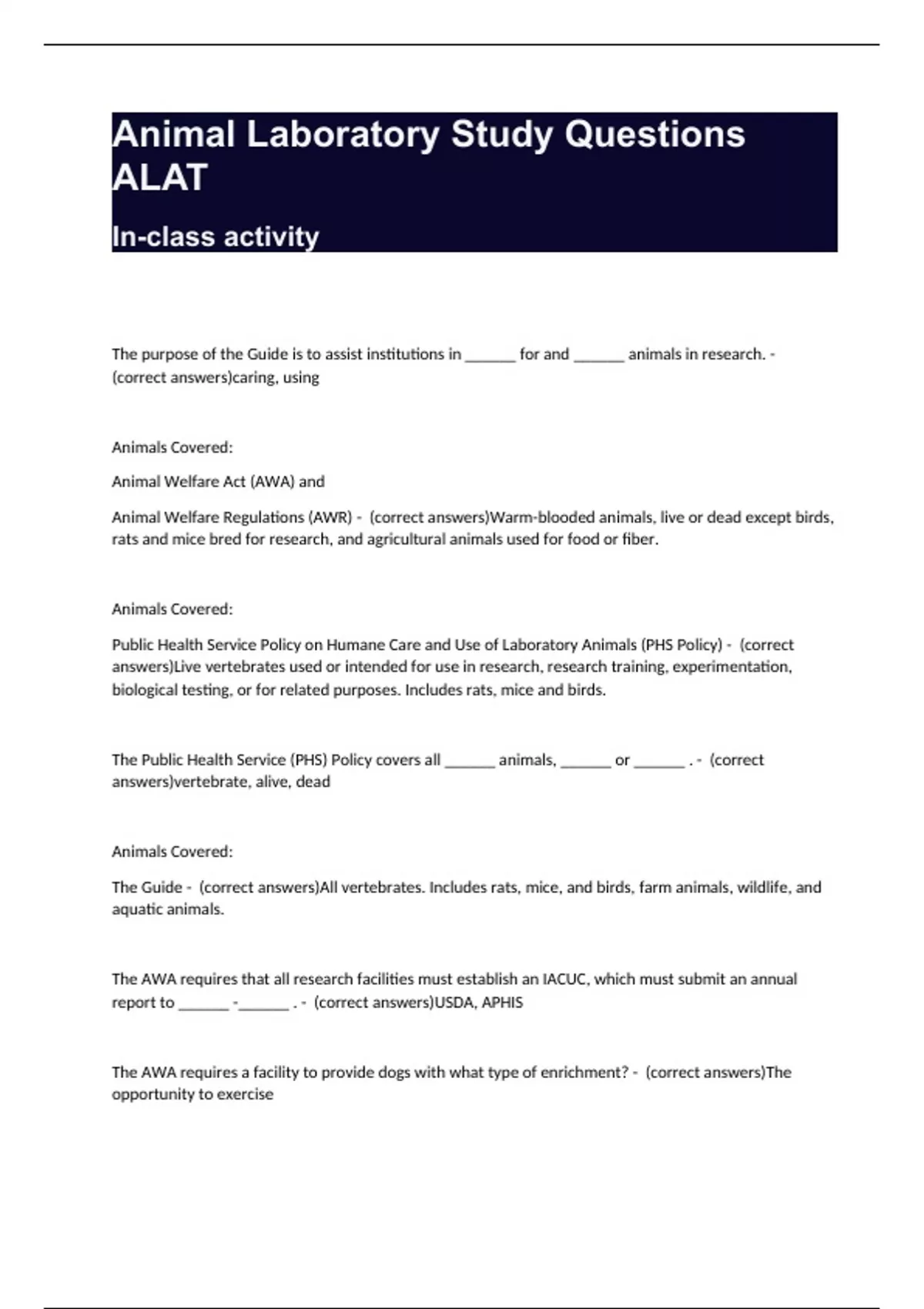 Animal Laboratory Study Questions ALAT In-class activity The purpose of the Guide is to assist institutions in ______ for and ______ animals in research. - (correct answers)caring, using Animals Covered: Animal Welfare Act (AWA) and Animal Welfare Regulations (AWR) - (correct answers)Warm-blooded animals, live or dead except birds, rats and mice bred for research, and agricultural animals used for food or fiber. Animals Covered: Public Health Service Policy on Humane Care and Use of Laboratory Animals (PHS Policy) - (correct answers)Live vertebrates used or intended for use in research, research training, experimentation, biological testing, or for related purposes. Includes rats, mice and birds. The Public Health Service (PHS) Policy covers all ______ animals, ______ or ______ . - (correct answers)vertebrate, alive, dead Animals Covered: The Guide - (correct answers)All vertebrates. Includes rats, mice, and birds, farm animals, wildlife, and aquatic animals. The AWA requires that all research facilities must establish an IACUC, which must submit an annual report to ______ -______ . - (correct answers)USDA, APHIS The AWA requires a facility to provide dogs with what type of enrichment? - (correct answers)The opportunity to exercise This document (and it's admendments) covers the use of all warm-blooded vertebrates, live or dead, with a few exceptions. - (correct answers)AWA (or AWR) An IACUC must have a chairman and how many other members? - (correct answers)two An IACUC must include a non-affiliated public member, and what 2 other specific members? - (correct answers)A veterinarian and a practicing scientist, both having experience with laboratory animals What agency administers and enforces Animal Welfare Regulations and how often do they inspect facilities? - (correct answers)APHIS (Animal and Plant Health Inspection Service), once a year The Guide and PHS policy require facilites to follow the euthanasia procedures contained in the ______ Guidelines on Euthanasia. - (correct answers)AVMA (American Veterinary Medical Asscoiation) The study of bioethics includes ______ and ______ issues concerning the use of live animals for research and the applications of that research. - (correct answers)social, moral ______ is a broad idea referring to the way people behave based on commonly held core values. - (correct answers)Ethics ______ aims to lessen pain or minimizes the number of painful procedures that the animals must undergo in an experiment. - (correct answers)Refinement ______ aims to replace animals with nonanimal alternatives or lower sentient species in an experiment. - (correct answers)Replacement ______ aims to reduce the number of animals used without affecting the validity of the experimental data. - (correct answers)Reduction Which animal is covered under the Animal Welfare Act (AWA) and Animal Welfare Regulations (AWR)?