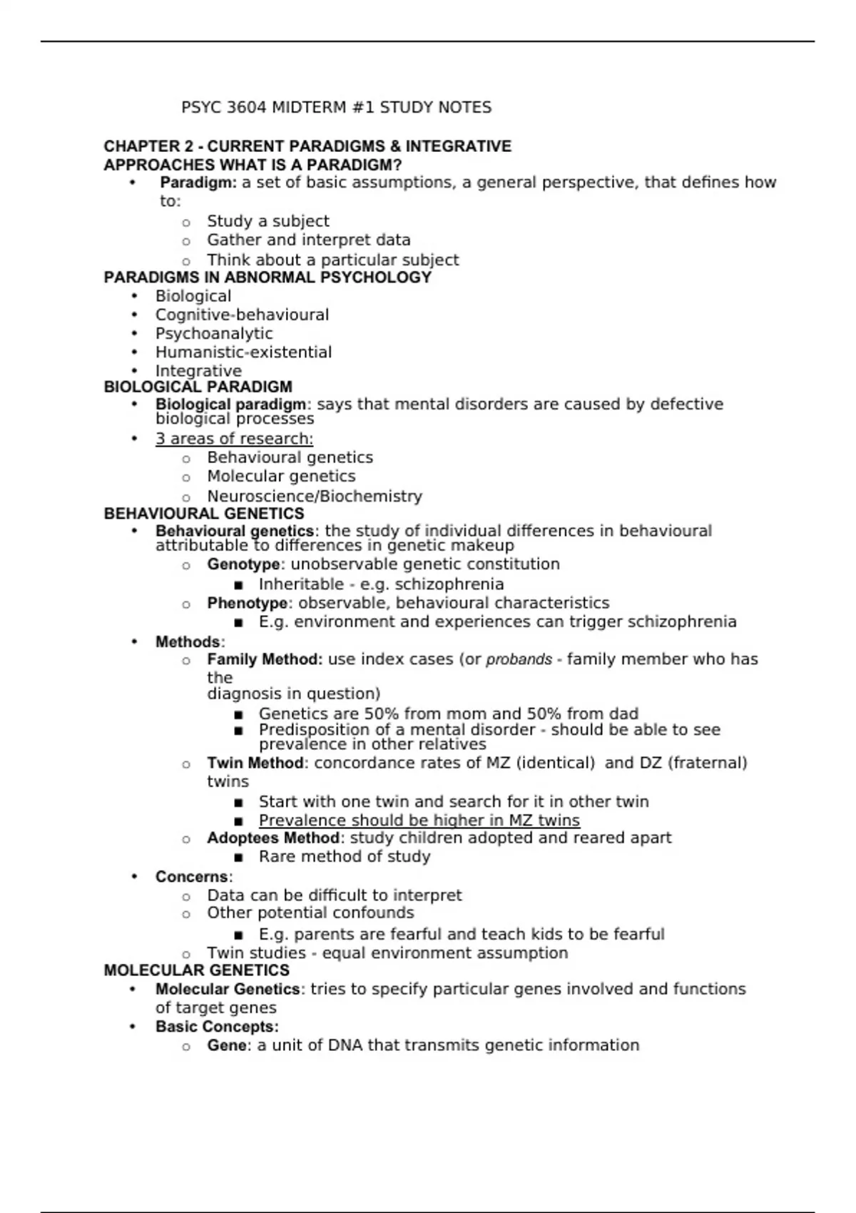 PSYC 3604 MIDTERM #1 STUDY NOTES CHAPTER 2 - CURRENT PARADIGMS & INTEGRATIVE APPROACHES WHAT IS A PARADIGM? • Paradigm: a set of basic assumptions, a general perspective, that defines how to: o Study a subject o Gather and interpret data o Think about a particular subject PARADIGMS IN ABNORMAL PSYCHOLOGY • Biological • Cognitive-behavioural • Psychoanalytic • Humanistic-existential • Integrative BIOLOGICAL PARADIGM • Biological paradigm: says that mental disorders are caused by defective biological processes • 3 areas of research: o Behavioural genetics o Molecular genetics o Neuroscience/Biochemistry BEHAVIOURAL GENETICS • Behavioural genetics: the study of individual differences in behavioural attributable to differences in genetic makeup o Genotype: unobservable genetic constitution ▪ Inheritable - e.g. schizophrenia o Phenotype: observable, behavioural characteristics ▪ E.g. environment and experiences can trigger schizophrenia • Methods: o Family Method: use index cases (or probands - family member who has the diagnosis in question) ▪ Genetics are 50% from mom and 50% from dad ▪ Predisposition of a mental disorder - should be able to see prevalence in other relatives o Twin Method: concordance rates of MZ (identical) and DZ (fraternal) twins ▪ Start with one twin and search for it in other twin ▪ Prevalence should be higher in MZ twins o Adoptees Method: study children adopted and reared apart ▪ Rare method of study • Concerns: o Data can be difficult to interpret o Other potential confounds ▪ E.g. parents are fearful and teach kids to be fearful o Twin studies - equal environment assumption MOLECULAR GENETICS • Molecular Genetics: tries to specify particular genes involved and functions of target genes • Basic Concepts: o Gene: a unit of DNA that transmits genetic information ..................................................continued.........................................................
