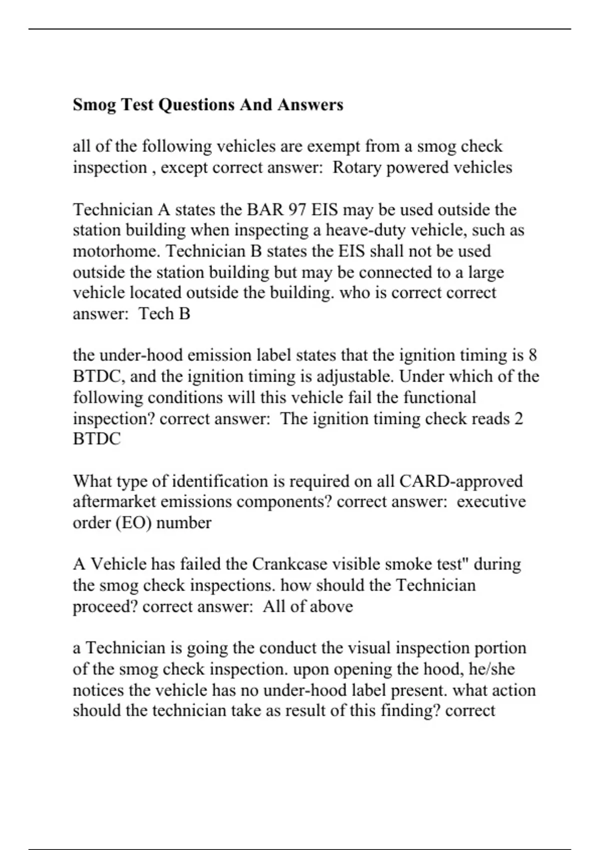all of the following vehicles are exempt from a smog check inspection , except correct answer: Rotary powered vehicles Technician A states the BAR 97 EIS may be used outside the station building when inspecting a heave-duty vehicle, such as motorhome. Technician B states the EIS shall not be used outside the station building but may be connected to a large vehicle located outside the building. who is correct correct answer: Tech B the under-hood emission label states that the ignition timing is 8 BTDC, and the ignition timing is adjustable. Under which of the following conditions will this vehicle fail the functional inspection? correct answer: The ignition timing check reads 2 BTDC What type of identification is required on all CARD-approved aftermarket emissions components? correct answer: executive order (EO) number A Vehicle has failed the Crankcase visible smoke test" during the smog check inspections. how should the Technician proceed? correct answer: All of above