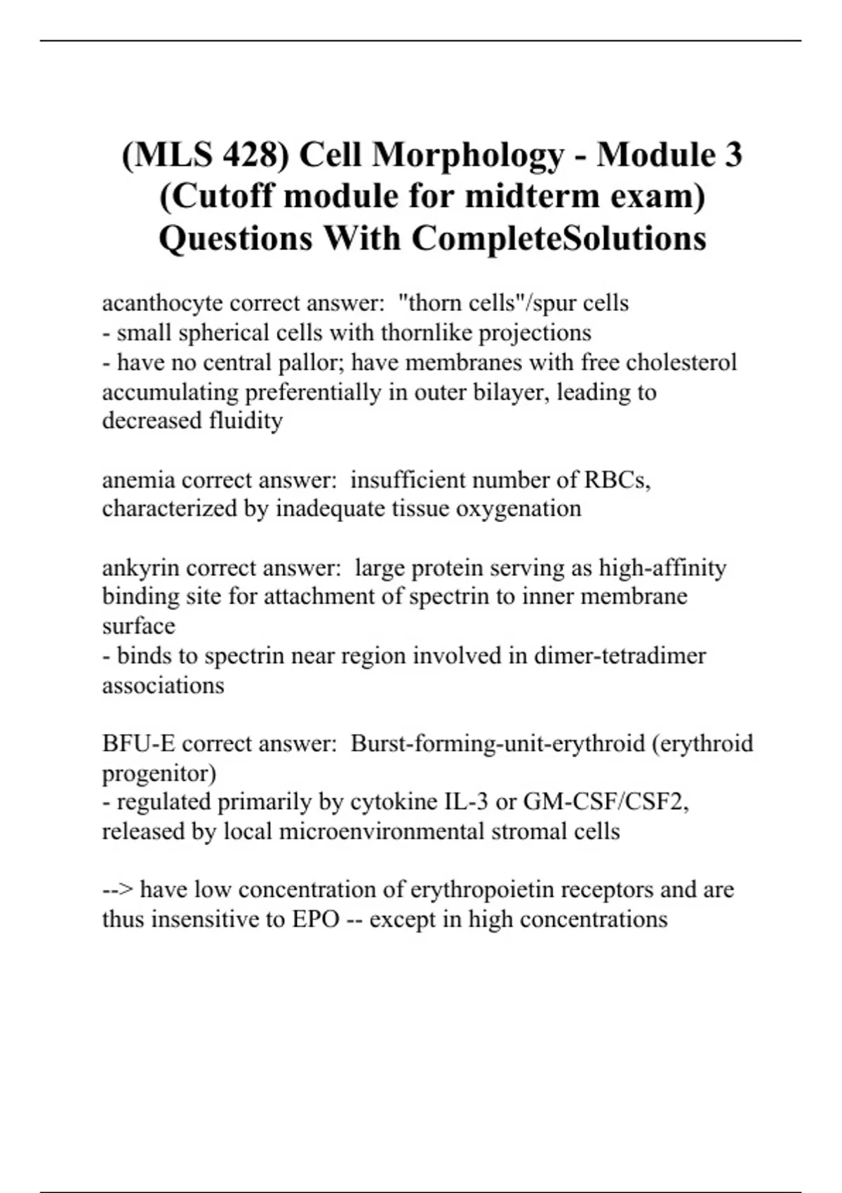 (MLS 428) Cell Morphology - Module 3 (Cutoff module for midterm exam) Questions With CompleteSolutions