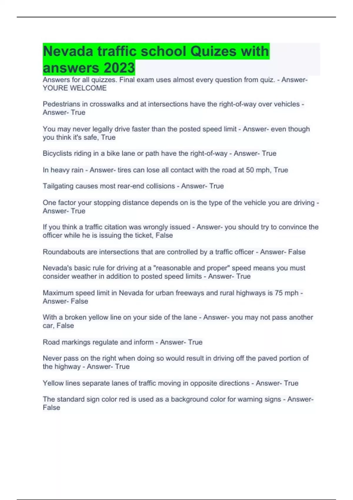 nevada traffic school quizes with answers 2023