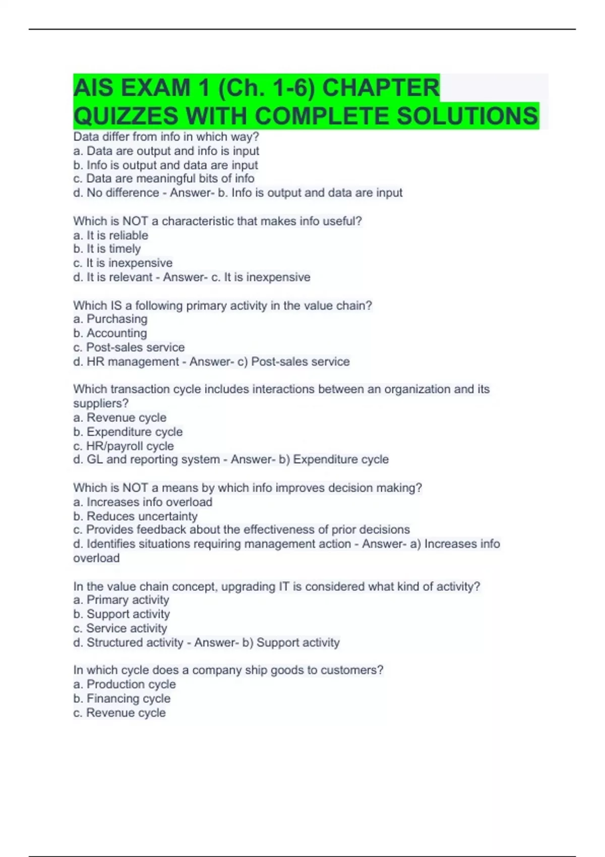 AIS EXAM 1 (Ch. 1-6) CHAPTER QUIZZES WITH COMPLETE SOLUTIONS