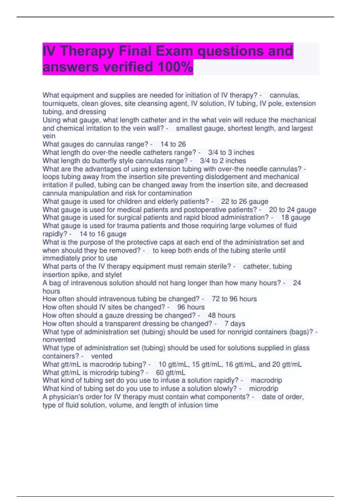 IV Therapy Final Exam questions and answers verified 100% What equipment and supplies are needed for initiation of IV therapy? - cannulas, tourniquets, clean gloves, site cleansing agent, IV solution, IV tubing, IV pole, extension tubing, and dressing Using what gauge, what length catheter and in the what vein will reduce the mechanical and chemical irritation to the vein wall? - smallest gauge, shortest length, and largest vein What gauges do cannulas range? - 14 to 26 What length do over-the needle catheters range? - 3/4 to 3 inches What length do butterfly style cannulas range? - 3/4 to 2 inches What are the advantages of using extension tubing with over-the needle cannulas? - loops tubing away from the insertion site preventing dislodgement and mechanical irritation if pulled, tubing can be changed away from the insertion site, and decreased cannula manipulation and risk for contamination What gauge is used for children and elderly patients? - 22 to 26 gauge What gauge is used for medical patients and postoperative patients? - 20 to 24 gauge What gauge is used for surgical patients and rapid blood administration? - 18 gauge What gauge is used for trauma patients and those requiring large volumes of fluid rapidly? - 14 to 16 gauge What is the purpose of the protective caps at each end of the administration set and when should they be removed? - to keep both ends of the tubing sterile until immediately prior to use What parts of the IV therapy equipment must remain sterile? - catheter, tubing insertion spike, and stylet A bag of intravenous solution should not hang longer than how many hours? - 24 hours How often should intravenous tubing be changed? - 72 to 96 hours How often should IV sites be changed? - 96 hours How often should a gauze dressing be changed? - 48 hours How often should a transparent dressing be changed? - 7 days What type of administration set (tubing) should be used for nonrigid containers (bags)? - nonvented What type of administration set (tubing) should be used for solutions supplied in glass containers? - vented What gtt/mL is macrodrip tubing? - 10 gtt/mL, 15 gtt/mL, 16 gtt/mL, and 20 gtt/mL What gtt/mL is microdrip tubing? - 60 gtt/mL What kind of tubing set do you use to infuse a solution rapidly? - macrodrip What kind of tubing set do you use to infuse a solution slowly? - microdrip A physician's order for IV therapy must contain what components? - date of order, type of fluid solution, volume, and length of infusion time If medication is ordered, identify what additional components to the order must be present. - date, drug, dose, frequency of drug, length of infusion time, and dilution strength True or False: Prior to initiating IV therapy, the nurse must check the expiration date on the solution, and inspect the solution and container for particles, discoloration, cracks, leaks, or punctures. - true What is time tape? What is the advantage of using time tape? Should you write directly on the solution container with a marker? Why or why not? - monitors IV fluid/medication delivery. You can quickly see if the rate of IV delivery needs to be adjusted. You should not write directly on IV solution bag as it is absorbed through the IV plastic bag What is the difference between IV push (IVP) or bolus versus intermittent IV therapy? Do LPNs administer IVP medications? - IVP is a medication given directly into the IV line and is pushed over a set time identified in IV Medication books, ie, Lasix 10mg over 1 min. A bolus is directly pushed into the IV line at a steady rate, ie 50% dextrose. LPNs do NOT give IVP medications Describe how to regulate an IV infusing by gravity. How high should the solution be positioned above the infusion site? - The nurse has to first figure out how many gtt/min to deliver the specific amount of fluid or the dose of medication. Using a watch with a second hand and using a manual controller to either speed up the gtt/min or the slow the gtt/ml. IV bag should be 36 inches above insertion site What is the difference between an electronic pump and a controller? - electronic pump controls IV fluid infusion by a computer and controller is controlled manually (gravity drip) by the nurse True or false: an infusion pump will stop administering an IV solution is an IV infiltrates. - false True or false: The best time to change the tubing is when the IV solution bag is changed. - true True or false: IV tubing sets will remain sterile for 72 hours even when the patient is receiving blood and fat emulsions. - false True or false: IV bags should be replaced when there is 200 cc left in the bag. - false True or false: The drop factor for microdrip tubing is 10gtt/mL. - false True or false: An IV running too slowly has the potential to clot. - true True or false: A sudden increase in the amount of solution infused may result in a patient's death. - true True or false: IV tubing is tagged with the date and time to indicate when tubing replacement is necessary. - true True or false: Failure to prime IV tubing with solution and remove air bubbles my result is a patient's death. - true What is the location of the basilic vein? - medial side of arm (little finger side) What are the advantages of the basilic vein? - large and easy to see; 16 to 22 gauge What are the disadvantages of the basilic vein? - rolls, difficult to stabilize location (put arm across chest, stand on opposite side of bed) What is the location of the cephalic vein? - lateral aspect (thumb side) of arm What are the advantages of the cephalic vein? - large, easy to access, 16 to 22 gauge; good for irritants