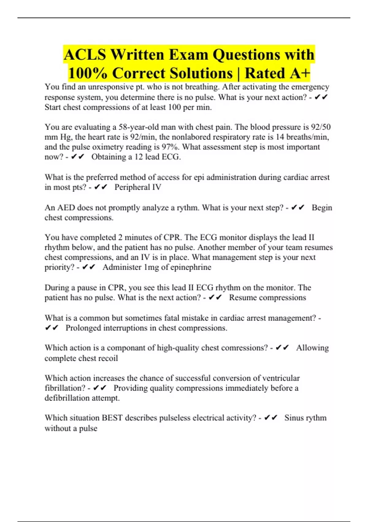 ACLS Written Exam Questions with 100% Correct Solutions | Rated A+