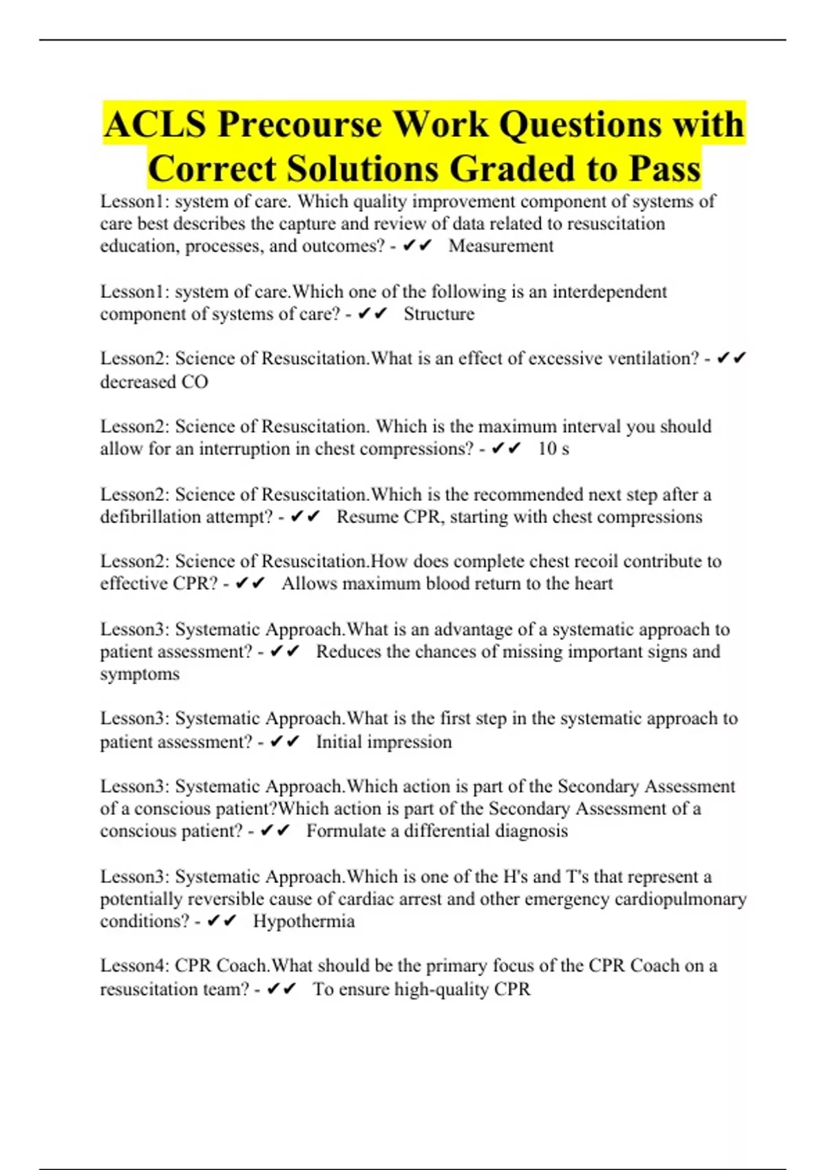 ACLS Precourse Work Questions with Correct Solutions Graded to Pass
