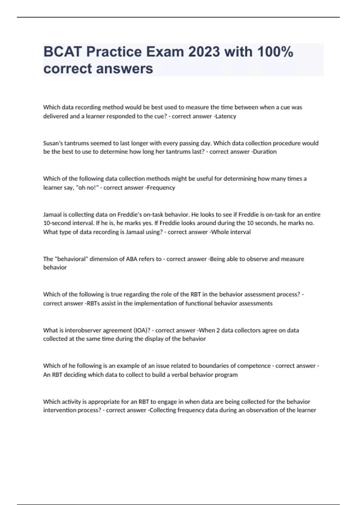 Which data recording method would be best used to measure the time between when a cue was delivered and a learner responded to the cue? - correct answer -Latency Susan's tantrums seemed to last longer with every passing day. Which data collection procedure would be the best to use to determine how long her tantrums last? - correct answer -Duration Which of the following data collection methods might be useful for determining how many times a learner say, "oh no!" - correct answer -Frequency Jamaal is collecting data on Freddie's on-task behavior. He looks to see if Freddie is on-task for an entire 10-second interval. If he is, he marks yes. If Freddie looks around during the 10 seconds, he marks no. What type of data recording is Jamaal using? - correct answer -Whole interval The "behavioral" dimension of ABA refers to - correct answer -Being able to observe and measure behavior Which of the following is true regarding the role of the RBT in the behavior assessment process? - correct answer -RBTs assist in the implementation of functional behavior assessments What is interobserver agreement (IOA)? - correct answer -When 2 data collectors agree on data collected at the same time during the display of the behavior Which of he following is an example of an issue related to boundaries of competence - correct answer -An RBT deciding which data to collect to build a verbal behavior program Which activity is appropriate for an RBT to engage in when data are being collected for the behavior intervention process? - correct answer -Collecting frequency data during an observation of the learner In ABA, which is the best reason why behaviors are targeted for increase? - correct answer -so learners can increase overall skill repertories Behavioral shaping involves - correct answer -Reinforcing successive approximations of a larger behavior In discrete trial instruction, a short instruction delivered to a learner is called: - correct answer -A discriminative stimulus (SD) Prompting before a learner can select an incorrect response is called: - correct answer -Errorless learning Which part of a discrete trial makes it more likely the learner will respond again? - correct answer -The reinforcer Teaching targets on the written skill acquisition plan - correct answer -Tell the behavior technician what to present Which of the following is an example of a 3-step direction? - correct answer -arms up, stand up, and touch head Which of the following is an example of a defective mand? - correct answer -crying when wanting a drink Which of the following is the best way to determine how to follow the child's lead during a naturalistic teaching session - correct answer -Watch the child and look for an opportunity to intervene Differential reinforcement of other behavior (DRO) involves - correct answer -Setting an interval for the problem behavior not to be displayed and reinforcing the child if it is not displayed Extinction works by - correct answer -Abruptly stopping reinforcement for problem behavior Punishment is the result of a stimulus following a behavior that serves to - correct answer -Reduce the behavior Which of the following could ensure that an intervention involving the use of punishment is effective? - correct answer -collecting and reviewing intervention data In a token reinforcement system, taking a toke away from a client who tore up a piece of paper is an example of - correct answer -response cost A most to least prompting sequence involves - correct answer -moving the prompts to naturally occurring ones Which of the following is a behavior? - correct answer -running a race The process of defining target behaviors using a precise definition is called: - correct answer -operationally defining the behavior Why is it important to define a behavior in observable and measurable terms? - correct answer -So the behaviors occurrence can be agreed upon by different observers Your supervisor tells you to use a strategy you have no idea how to use. What is the best response to the request? - correct answer -Tell the supervisor immediately that you do not know how to use the strategy and ask for them to demonstrate it Which of the following is an example of a dual relationship? - correct answer -Tina and Lois are beast friends. Lois is an RBT who works with Tina's son What does the term "least intrusive" mean as it relates to behavior change plans? - correct answer -Behavior change plans that lace the least amount of risk or discomfort RBTs assist in delivering services under the direction and close supervision of - correct answer -An RBT supervisor or an RBT requirements coordinator What