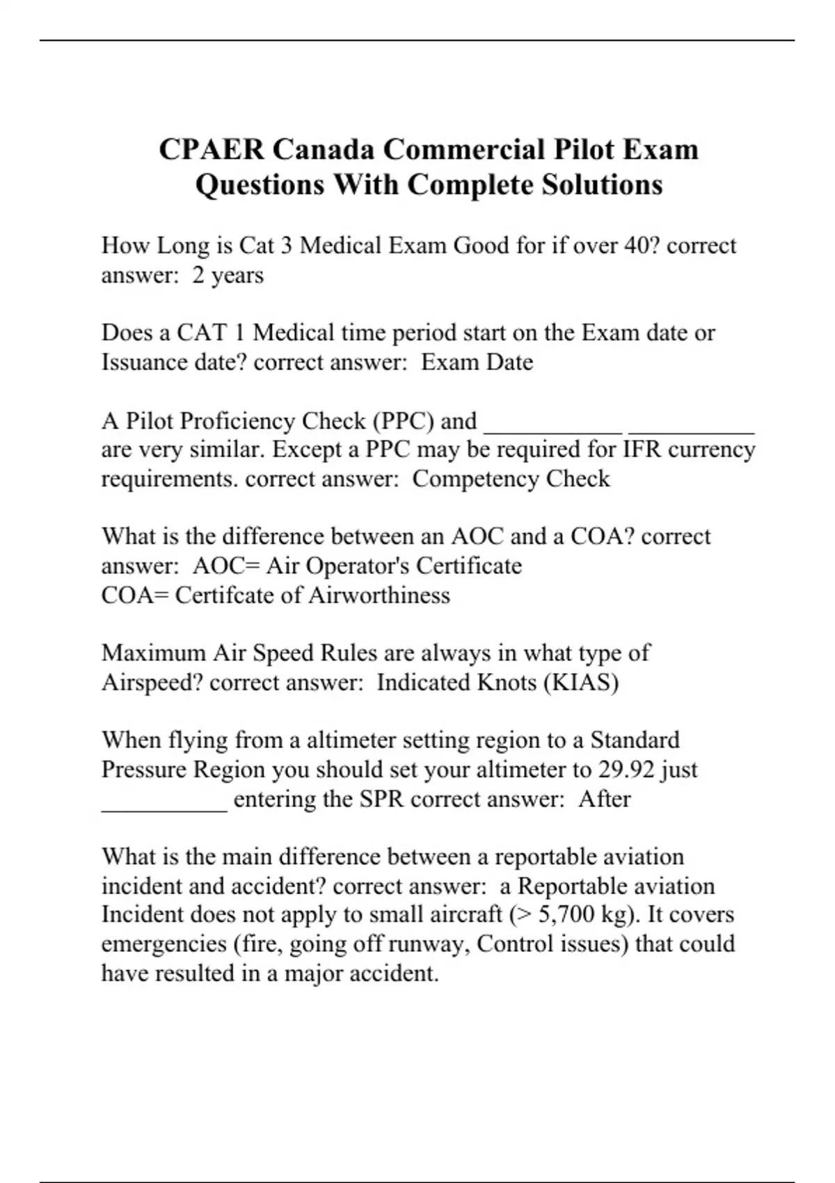 CPAER Canada Commercial Pilot Exam Questions With Complete Solutions