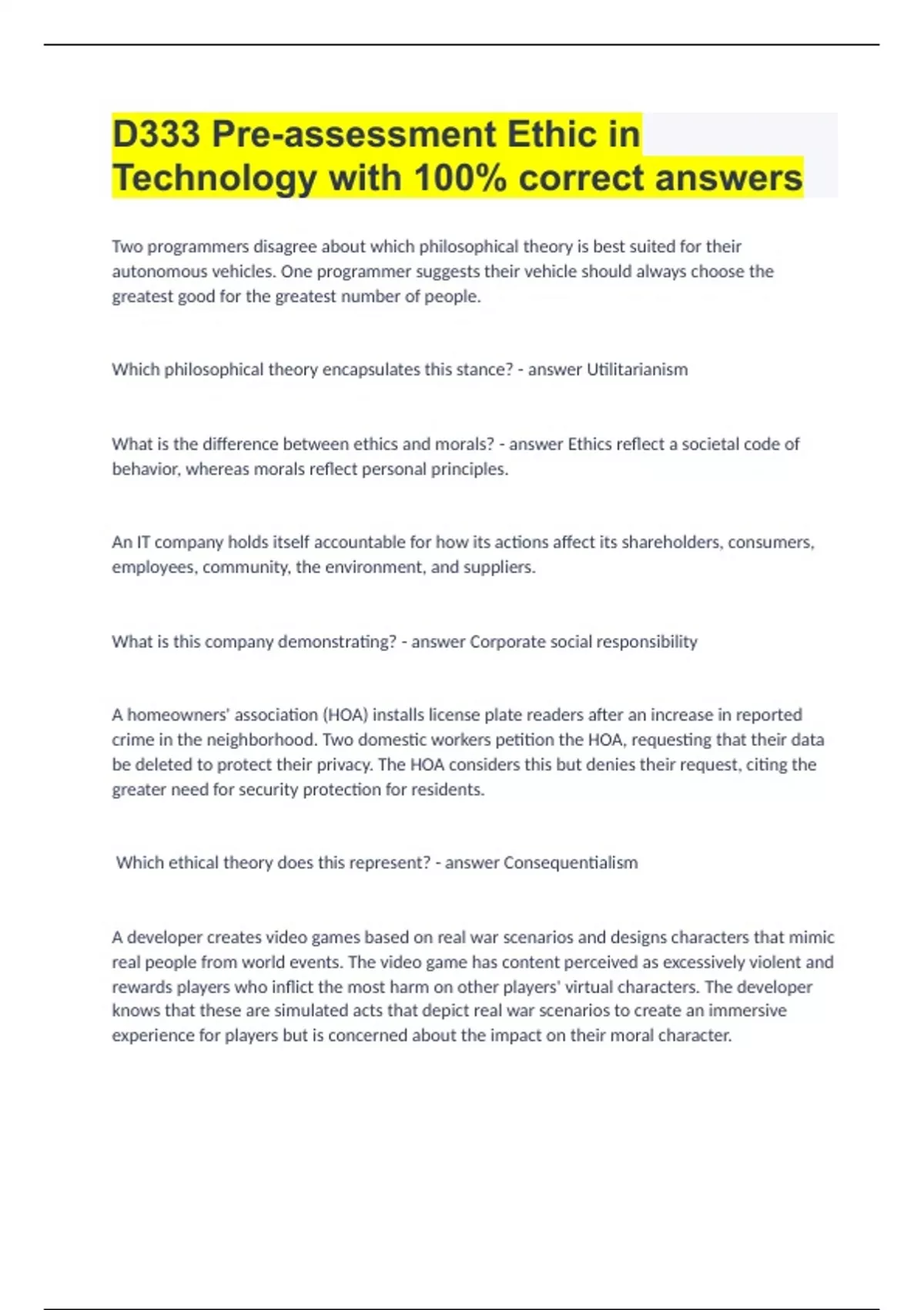 D333 Pre-assessment Ethic in Technology with 100% correct answers