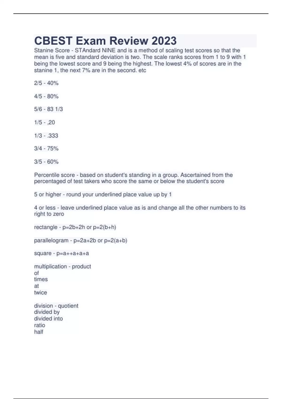 CBEST Exam Review 2023 Stanine Score - STAndard NINE and is a method of scaling test scores so that the mean is five and standard deviation is two. The scale ranks scores from 1 to 9 with 1 being the lowest score and 9 being the highest. The lowest 4% of scores are in the stanine 1, the next 7% are in the second. etc 2/5 - 40% 4/5 - 80% 5/6 - 83 1/3 1/5 - ,20 1/3 - .333 3/4 - 75% 3/5 - 60% Percentile score - based on student's standing in a group. Ascertained from the percentaged of test takers who score the same or below the student's score 5 or higher - round your underlined place value up by 1 4 or less - leave underlined place value as is and change all the other numbers to its right to zero rectangle - p=2b+2h or p=2(b+h) parallelogram - p=2a+2b or p=2(a+b) square - p=a++a+a+a multiplication - product of times at twice division - quotient divided by divided into ratio half each triangle - p=a+b+c percent increase - change/starting point addition - addition sum total plus increase more than greater than place value - millions hundred thousands ten thousands thousands hundreds tens ones/unit Probability - Number of favorable outcomes/ number of possible outcomes dividing fractions - Invert (turn upside down) the second fraction and multiply. Reduce if necessary multiplying fractions - multiply the numerators, then multiply the denominators. Reduce to lowest terms if necessary. Tip: Can also use cancelling to reduce the answer Multiplying Mixed Numbers - 1) multiply the whole number 2) add this to the numerator of the fraction 3) this is now your numerator 4) the denominator stays the same reduce if needed changing decimals to percents - move the decimal point two places to the right insert a percent sign ex: .75 = 75% .05 = 5 % changing percents to decimals - eliminate the percents to decimals Move the decimal point two places to the left ( sometimes adding zeros is necessary) Continues...