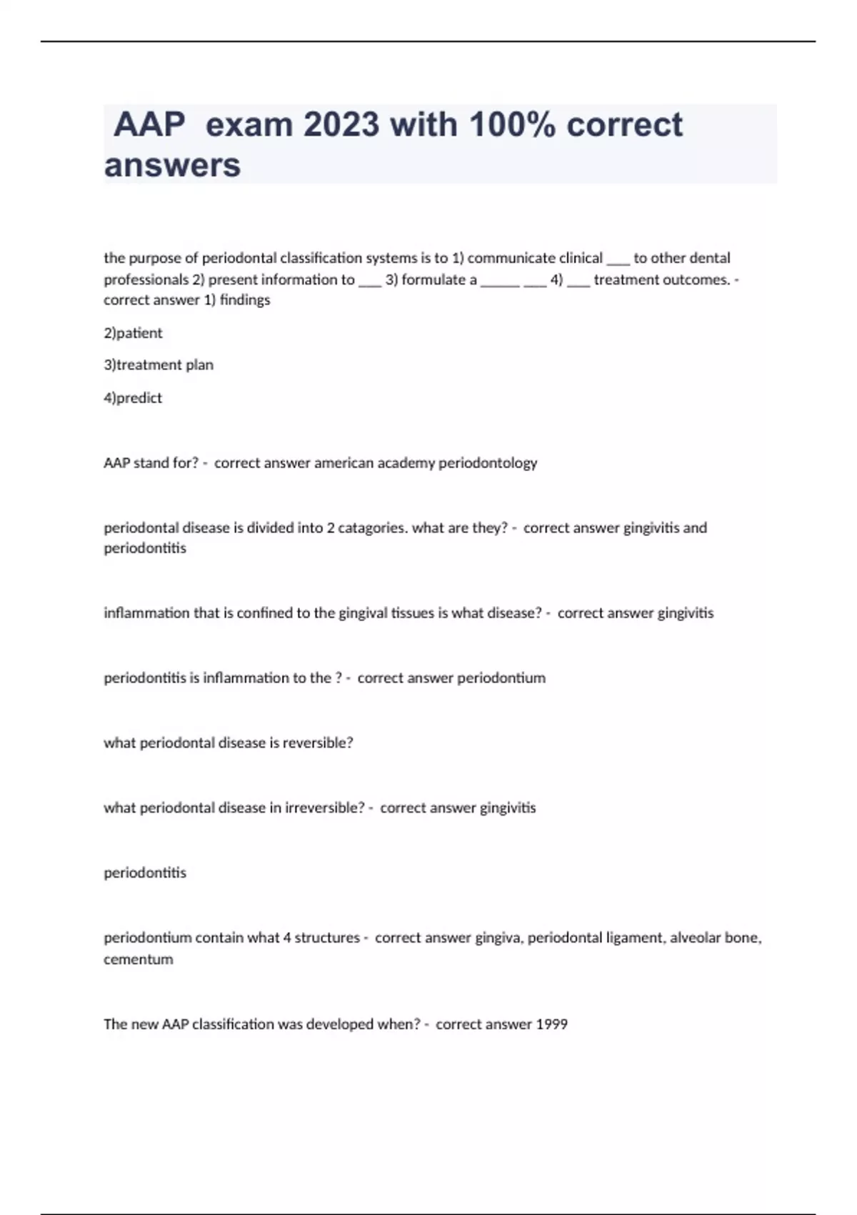 the purpose of periodontal classification systems is to 1) communicate clinical ___ to other dental professionals 2) present information to ___ 3) formulate a _____ ___ 4) ___ treatment outcomes. - correct answer 1) findings 2)patient 3)treatment plan 4)predict AAP stand for? - correct answer american academy periodontology periodontal disease is divided into 2 catagories. what are they? - correct answer gingivitis and periodontitis inflammation that is confined to the gingival tissues is what disease? - correct answer gingivitis periodontitis is inflammation to the ? - correct answer periodontium what periodontal disease is reversible? what periodontal disease in irreversible? - correct answer gingivitis periodontitis periodontium contain what 4 structures - correct answer gingiva, periodontal ligament, alveolar bone, cementum The new AAP classification was developed when? - correct answer 1999 t/f: the 1999 AAP classification is used by periodontitis and general dentists - correct answer false: general dentists may not be familiar with 1999 AAP classification there are __ categories associated with the AAP classification system - correct answer 8 put the following 8 AAP categories in order: chronic periodontitis periodontitis associated with endodontic lesions gingival diseases abscesses off the Periodontium necrotizing periodontal diseases aggressive periodontitis developmental or acquired deformities and condition periodontitis as a manifestation of systemic diseases - correct answer 1-gingival diseases 2-chronic periodontitis 3-aggressiv