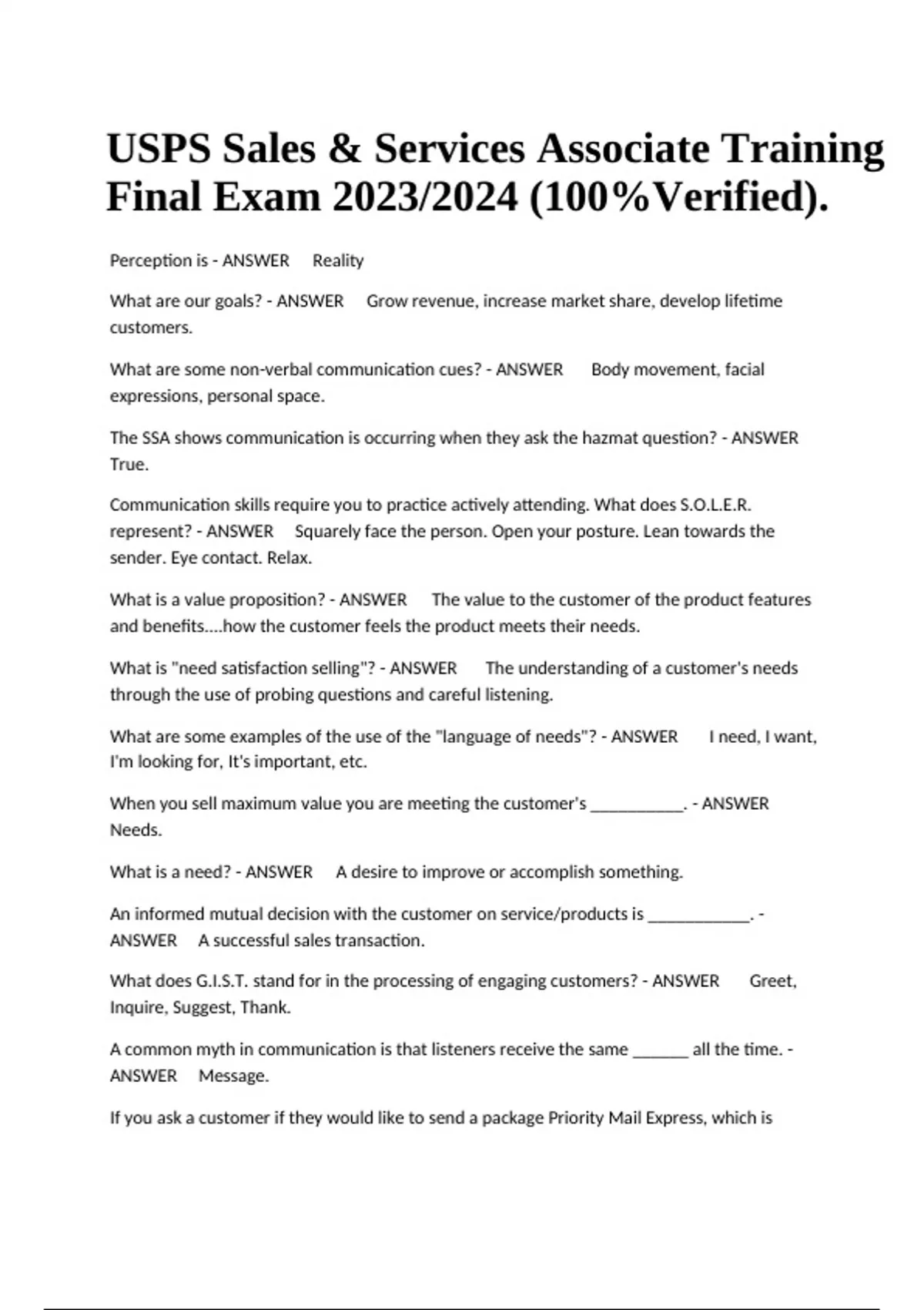 USPS Sales & Services Associate Training Final Exam 2023/2024 (100%Verified). Perception is - ANSWER Reality What are our goals? - ANSWER Grow revenue, increase market share, develop lifetime customers. What are some non-verbal communication cues? - ANSWER Body movement, facial expressions, personal space. The SSA shows communication is occurring when they ask the hazmat question? - ANSWER True. Communication skills require you to practice actively attending. What does S.O.L.E.R. represent? - ANSWER Squarely face the person. Open your posture. Lean towards the sender. Eye contact. Relax. What is a value proposition? - ANSWER The value to the customer of the product features and benefits....how the customer feels the product meets their needs. What is "need satisfaction selling"? - ANSWER The understanding of a customer's needs through the use of probing questions and careful listening. What are some examples of the use of the "language of needs"? - ANSWER I need, I want, I'm looking for, It's important, etc. When you sell maximum value you are meeting the customer's __________. - ANSWER Needs. What is a need? - ANSWER A desire to improve or accomplish something. An informed mutual decision with the customer on service/products is ___________. - ANSWER A successful sales transaction. What does G.I.S.T. stand for in the processing of engaging customers? - ANSWER Greet, Inquire, Suggest, Thank. A common myth in communication is that listeners receive the same ______ all the time. - ANSWER Message. If you ask a customer if they would like to send a package Priority Mail Express, which is USPS Sales & Services Associate Training Final Exam 2023/2024 (100%Verified). guaranteed to arrive tomorrow, with $100 insurance and tracking included.....what park of G.I.S.T. would this be? - ANSWER Suggest. Once you determine how a customer wants to mail a package and have offered additional insurance, what additional products may you suggest? - ANSWER Stamps, PO Boxes, money orders, packaging supplies, greeting cards, passports. What is the maximum weight for any package? - ANSWER 70 lbx. How do you determine the dimensions of a mailpiece? - ANSWER Combine the length plus girth. What are the 5 processing categories? - ANSWER Letters, flats (large envelopes), machinable parcels (SPRS), irregular parcels and outside parcels (both non-machinable). What is our "Retail Motto"? - ANSWER Clean, stocked and Friendly...Everyday!. What is the maximum length and girth (combined) for a parcel? - ANSWER 130" for standard post only. Oversize charges will apply for packages exceeding 108". When are balloon charges applied? - ANSWER Packages weighing less than 20 lbs that measure over 84" but not more than 108" (length + girth combined) that are shipped Priority mail zones 104 or Standard to all zones. If an article meets the size qualifications for a large envelope (flat) but is rigid...what price category is it charged? - ANSWER Parcel rate. If a letter size envelope is thicker than 1/4" but is even in thickness....what price category is it charged? - ANSWER Flat (large envelope). What is a customer charged when a balloon surcharge applies? - ANSWER 20 lb rate. When is DIM (dimensional) weight applied? - ANSWER Only for Priority packages which exceed 1 cubic foot and are mailed zones 5-8. Dimensional weight pricing is determined by length, width and thickness (height) and __________. - ANSWER Weight. What is the only article that can possibly have a non-machinable surcharge? - ANSWER Letter. If an article is too heavy, too large or too small it is ______________. - ANSWER Non-mailable. How does knowing the products you sell benefit customers and the post office? - ANSWER Strengthens communication skills, boosts enthusiasm, and assists in overcoming concerns. Name some benefits of Priority Mail Express. - ANSWER Fastest shipping, guaranteed delivery, delivery 365 days per year (even Sundays and Holidays), no residential surcharges, no fuel charges, free tracking, $100 free insurance, signature available, delivery to PO Boxes, flat rate boxes and envelopes, free shipping supplies. Name some benefits of Priority Mail. - ANSWER Normally 2-3 day delivery, free shipping supplies, fast and affordable, flat rate boxes and envelopes that "if it fits, it ships", delivery to every address - even PO Boxes, Saturday delivery at no extra cost, extra services available. What is the maximum amount of insurance you can purchase? - ANSWER $5,000. What is the maximum amount of insurance that can be purchased with Registered Mail? - ANSWER $25,000. What are the 3 ways to add insurance to a package? - ANSWER Online, post office, Kiosk. Can additional insurance be purchased at the window if it has already been purchased online or at the Kiosk? - ANSWER No. What is the maximum weight and size for Priority packages? - ANSWER 70 lbs, 108" length + girth combined. What is EDDM? - ANSWER Every Door Direct Mail. Why is product knowledge important? - ANSWER It provides satisfaction in helping a customer, increases customer knowledge, increases revenue, increases interaction between the SSA and customer, empowers the SSA to be the expert and ensures loyal, satisfied, returning customers. Name some of the benefits of renting a PO Box? - ANSWER Convenient, early delivery, secure, extended hours, affordable, permanent, good business, private. How can you renew a PO Box? - ANSWER Online with a credit/debit card, through an automatic renewal process, self service Kiosk, mail in a check or money order, pay at the post office in person. When does Dimensional Weight (DIM) pricing apply? - ANSWER Priority mail being shipped to zones 5-8 which are larger than 1 cubic foot. What qualifies an article to be classified as 1st class mail? - ANSWER Less than 13 oz, handwritten or typewritten personal correspondence, postcards, and Business Reply Mail.
