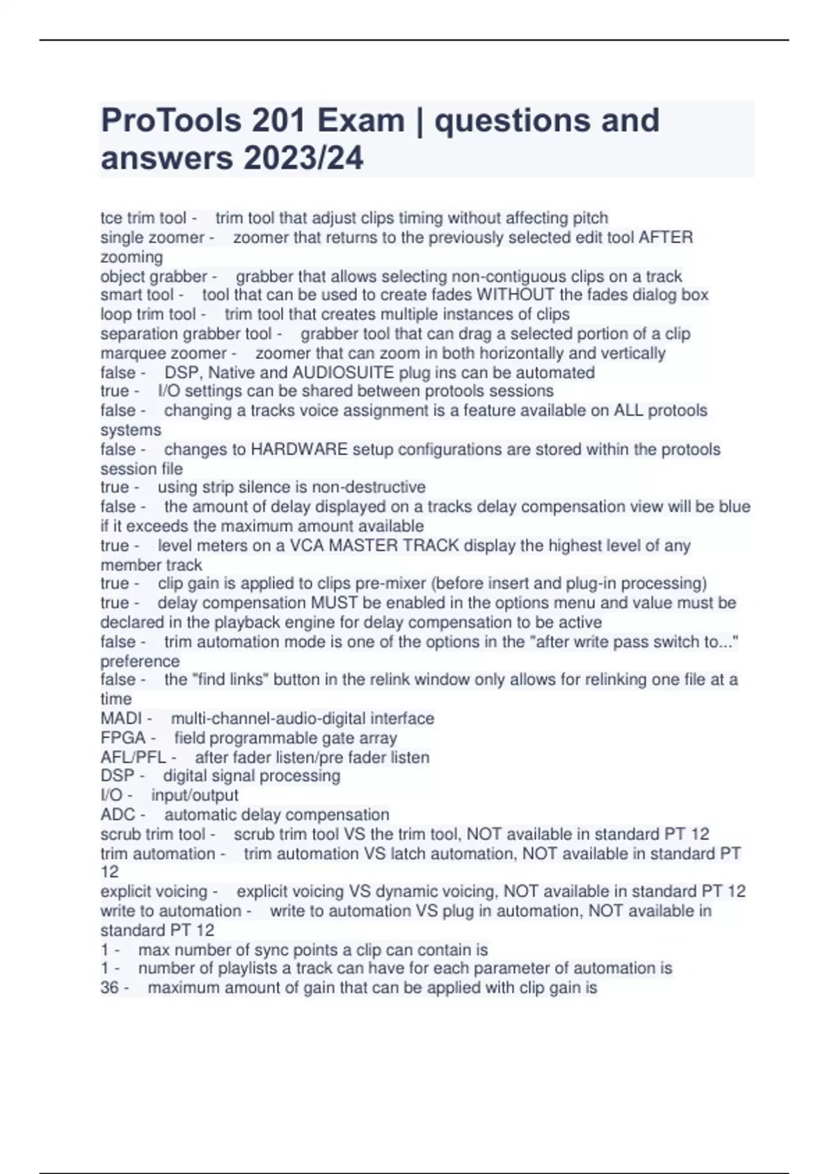 ProTools 201 Exam | questions and answers 2023/24 tce trim tool - trim tool that adjust clips timing without affecting pitch single zoomer - zoomer that returns to the previously selected edit tool AFTER zooming object grabber - grabber that allows selecting non-contiguous clips on a track smart tool - tool that can be used to create fades WITHOUT the fades dialog box loop trim tool - trim tool that creates multiple instances of clips separation grabber tool - grabber tool that can drag a selected portion of a clip marquee zoomer - zoomer that can zoom in both horizontally and vertically false - DSP, Native and AUDIOSUITE plug ins can be automated true - I/O settings can be shared between protools sessions false - changing a tracks voice assignment is a feature available on ALL protools systems false - changes to HARDWARE setup configurations are stored within the protools session file true - using strip silence is non-destructive false - the amount of delay displayed on a tracks delay compensation view will be blue if it exceeds the maximum amount available true - level meters on a VCA MASTER TRACK display the highest level of any member track true - clip gain is applied to clips pre-mixer (before insert and plug-in processing) true - delay compensation MUST be enabled in the options menu and value must be declared in the playback engine for delay compensation to be active false - trim automation mode is one of the options in the "after write pass switch to..." preference false - the "find links" button in the relink window only allows for relinking one file at a time MADI - multi-channel-audio-digital interface FPGA - field programmable gate array AFL/PFL - after fader listen/pre fader listen DSP - digital signal processing I/O - input/output ADC - automatic delay compensation scrub trim tool - scrub trim tool VS the trim tool, NOT available in standard PT 12 trim automation - trim automation VS latch automation, NOT available in standard PT 12 explicit voicing - explicit voicing VS dynamic voicing, NOT available in standard PT 12 write to automation - write to automation VS plug in automation, NOT available in standard PT 12 1 - max number of sync points a clip can contain is 1 - number of playlists a track can have for each parameter of automation is 36 - maximum amount of gain that can be applied with clip gain is 1 - number of tracks that can simultaneously play through an assigned voice is 1 - maximum number of HD OMNI interfaces a protools system can use is pla