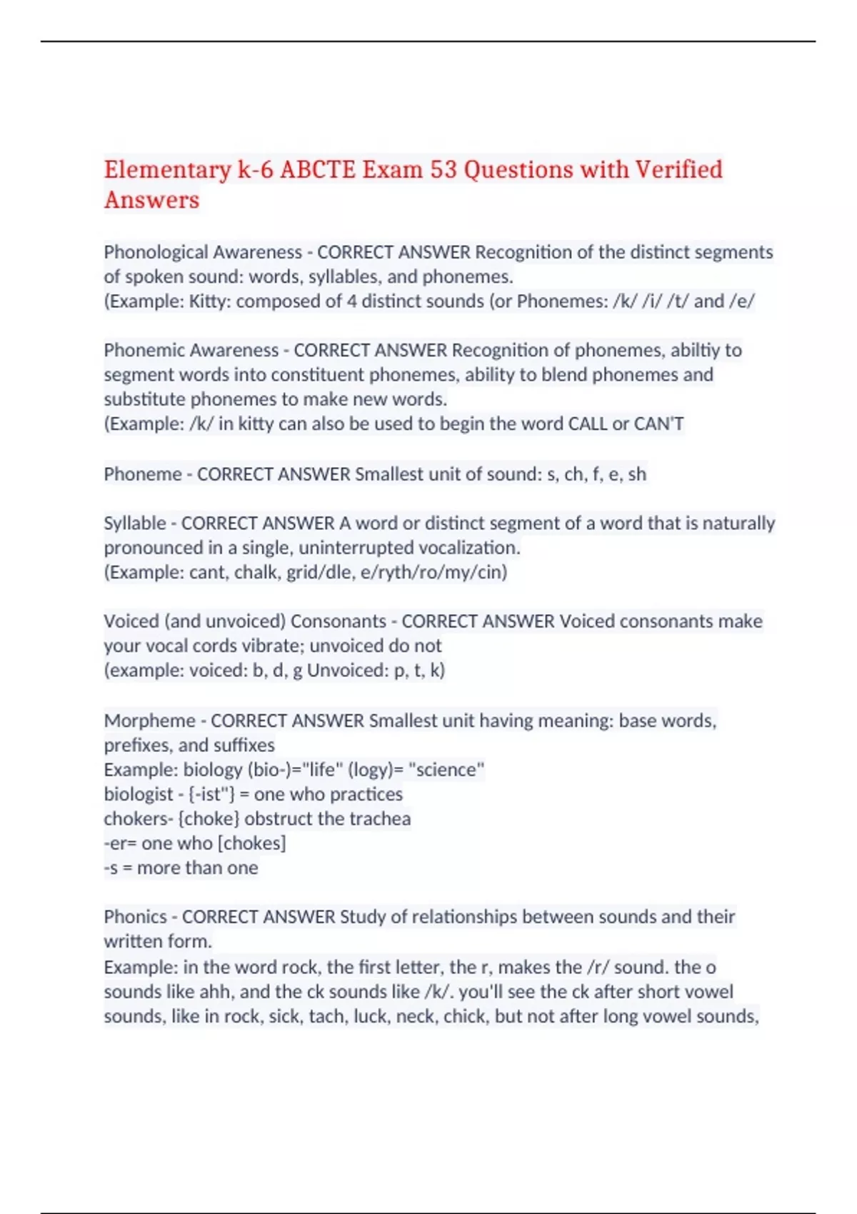 Elementary k-6 ABCTE Exam 53 Questions with Verified Answers Phonological Awareness - CORRECT ANSWER Recognition of the distinct segments of spoken sound: words, syllables, and phonemes. (Example: Kitty: composed of 4 distinct sounds (or Phonemes: /k/ /i/ /t/ and /e/ Phonemic Awareness - CORRECT ANSWER Recognition of phonemes, abiltiy to segment words into constituent phonemes, ability to blend phonemes and substitute phonemes to make new words. (Example: /k/ in kitty can also be used to begin the word CALL or CAN'T Phoneme - CORRECT ANSWER Smallest unit of sound: s, ch, f, e, sh Syllable - CORRECT ANSWER A word or distinct segment of a word that is naturally pronounced in a single, uninterrupted vocalization. (Example: cant, chalk, grid/dle, e/ryth/ro/my/cin) Voiced (and unvoiced) Consonants - CORRECT ANSWER Voiced consonants make your vocal cords vibrate; unvoiced do not (example: voiced: b, d, g Unvoiced: p, t, k) Morpheme - CORRECT ANSWER Smallest unit having meaning: base words, prefixes, and suffixes Example: biology (bio-)="life" (logy)= "science" biologist - {-ist"} = one who practices chokers- {choke} obstruct the trachea -er= one who [chokes] -s = more than one Phonics - CORRECT ANSWER Study of relationships between sounds and their written form. Example: in the word rock, the first letter, the r, makes the /r/ sound. the o sounds like ahh, and the ck sounds like /k/. you'll see the ck after short vowel sounds, like in rock, sick, tach, luck, neck, chick, but not after long vowel sounds, like in lake, nuke, poke, hike, and cheek. words that end with a "vowel + consonant + e" combination (VCE), the vowel is long, which means that it sounds like its name: ay, ee, eye, oh, you. Phoneme - CORRECT ANSWER represents smallest element of spoken language grapheme - CORRECT ANSWER the written representation of a phoneme, and is usally the letter (or letters) that make that sound. if the grapheme contains two letters, then it is a diagraph. diagraph - CORRECT ANSWER a grapheme that contains two letters morpheme - CORRECT ANSWER smallest unit of a word that has meaning Alphabetic Principle - CORRECT ANSWER The Idea that letters can represent sounds Smallest units of SPEECH SOUNDS - CORRECT ANSWER Phonemes Symbols that represent PHonemes (ex: letters) - CORRECT ANSWER Graphemes Made up of more than one letter (ex: ch - CORRECT ANSWER Digraphs Breaking down words into their component PHONEMES - CORRECT ANSWER Segmenting Morpheme is: - CORRECT ANSWER The smallest unit of LANGUAGE that creates MEANING The word "choke" is a - CORRECT ANSWER Morpheme In the word "choker" the "er" is - CORRECT ANSWER Morpheme (because "er" conveys meaning all by itself. It refers to the first part of the word, the one who chokes. // represent what? - CORRECT ANSWER phonemes { } represent what? - CORRECT ANSWER morphemes {a-} - CORRECT ANSWER Morpheme- is a prefix that adds a negative denotation to such words as amoral, apolitical, atheist, and apnea. -ist ending is a... - CORRECT ANSWER MORPHEME- smallest units of language that can have meaning. -ist suffix means "one who practices" "HARPIST" Name the Phonemes, unvoiced consonant, morpheme, onset and the rime. - CORRECT ANSWER phonemes: /h/ /a/ /r/ /p/ /i/ /s/ /t/ unvoiced consonant: "h" Morpheme: -ist "one who practices onset: "h" rime: "arp" Onset and Rime: - CORRECT ANSWER parts of SYLLABLES; the ONSET is the first consonant the RIME is made up of the vowels that follow and consonants that follow the ONSET Onset - CORRECT ANSWER First Consonant Rime - CORRECT ANSWER made up of the vowels that follow and consonants that follow the onset Synthetic Phonics - CORRECT ANSWER Teaching the basics of GRAPHEME-PHONEME RELATIONSHIPS (students learn to blend these into words) Explicit - CORRECT ANSWER clear and to the point systematic - CORRECT ANSWER successful modes of instruction are deliberate and measure example of SYNTHETIC PHONICS: - CORRECT ANSWER /b/ /a/ /t/ /k/- teacher systematically explores simple words that employ these PHONEMES. CAT and BAT, blending the phonemes to produce MORPHEMES Blending - CORRECT ANSWER knowing a group of phonemes students can combine these to form words. Segmenting - CORRECT ANSWER breaking words down into the phonemes that comprise it. (segmenting "tap" /t/ /a/ /p/ DECODING - CORRECT ANSWER (associated with reading) decoding means using phonemic knowledge and prior knowledge of spelling conventions to read a word. (experienced readers decode rapidly. early readers use blending to slowly decode words usually one at a time) Analogy Phonics - CORRECT ANSWER Prior Knowledge: using a word students are familiar with to pronounce another word. such as /b/ank and /p/ /r/ank. Analytic Phonics - CORRECT ANSWER Prior Knowledge: similar to analogy but small difference. the way you introduce the /p/ and the /r/ is different from the analogy method. you would ask the students a word that contains /pr/ blend like "pretty" and ask them a word that starts like "pretty" and ends like "bank" to come up with the word "PRANK" EMBEDDED PHONICS - CORRECT ANSWER (least popular) analogy or analytic approaches are fine, the difference is you are addressing a word type as it happens Recognizing when words begin or end with the same sound is what type of phonological awareness skill? - CORRECT ANSWER Analogy Phonics Difference between Analogy Phonics and Analytic Phonics? - CORRECT ANSWER Analytic Phonics uses FULL WORDS instead of phonemes out of context Phonics through spelling: - CORRECT ANSWER explicit phonics instructional methods begins with a spoken word and ends with a written word starts at the phoneme level and builds toward the word level - CORRECT ANSWER Synthetic Phonics combining previously learned phonemes to form words (segmenting is breaking words up into phonemes) - CORRECT ANSWER Blending The use of speling patterns and phonemic awareness to recognize a word - CORRECT ANSWER Decoding should be explicit, teacher takes a deliberate course of 