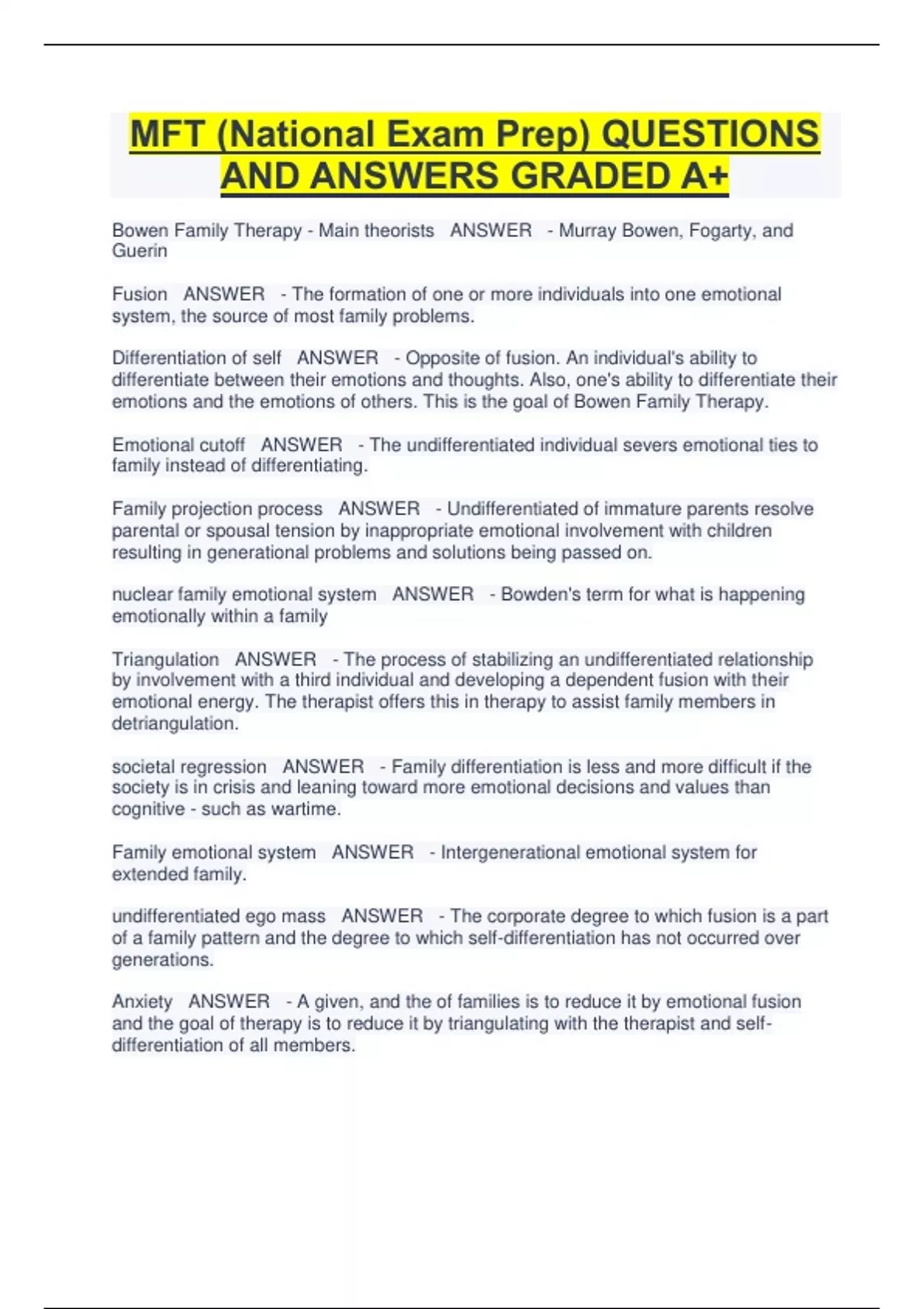 MFT (National Exam Prep) QUESTIONS AND ANSWERS GRADED A+