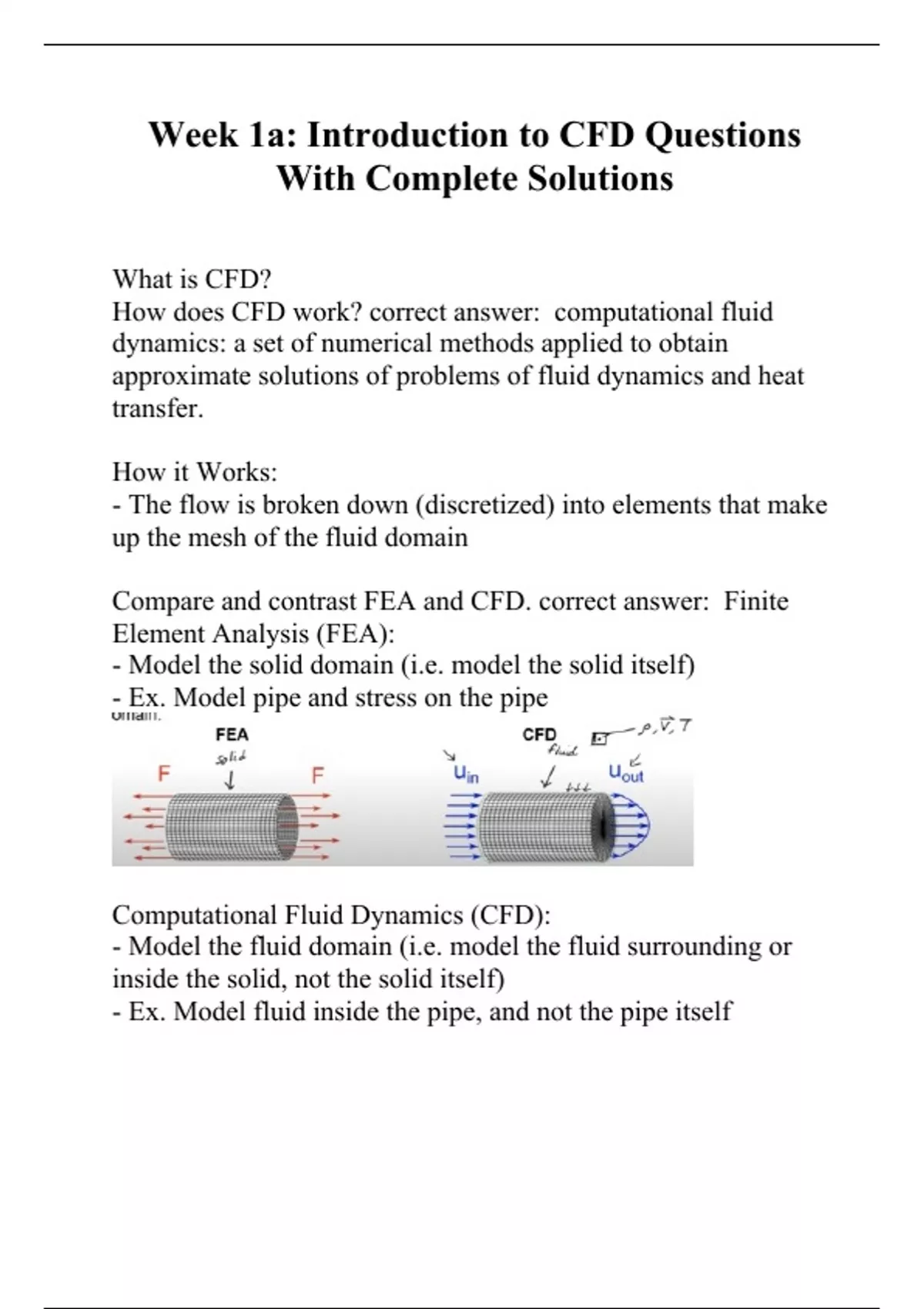 What is CFD? How does CFD work? correct answer: computational fluid dynamics: a set of numerical methods applied to obtain approximate solutions of problems of fluid dynamics and heat transfer. How it Works: - The flow is broken down (discretized) into elements that make up the mesh of the fluid domain Compare and contrast FEA and CFD. correct answer: Finite Element Analysis (FEA): - Model the solid domain (i.e. model the solid itself) - Ex. Model pipe and stress on the pipe Computational Fluid Dynamics (CFD): - Model the fluid domain (i.e. model the fluid surrounding or inside the solid, not the solid itself) - Ex. Model fluid inside the pipe, and not the pipe itself What are the 3 methods that can be used to solve fluid problems? correct answer: 1. Analytically - Theoretical equations 2. Experimentally - Replicate the problem and test it 3. Computationally - CFD Define the analytical solutions method to solving fluid problems. What are the advantages and disadvantages of using analytical solutions to solve fluid problems? correct answer: as the name implies: arriving to conclusions based on theoretical considerations - Ex. using conservation of mass and conservation of momentum to solve for the velocity of a fluid flowing through a pipe