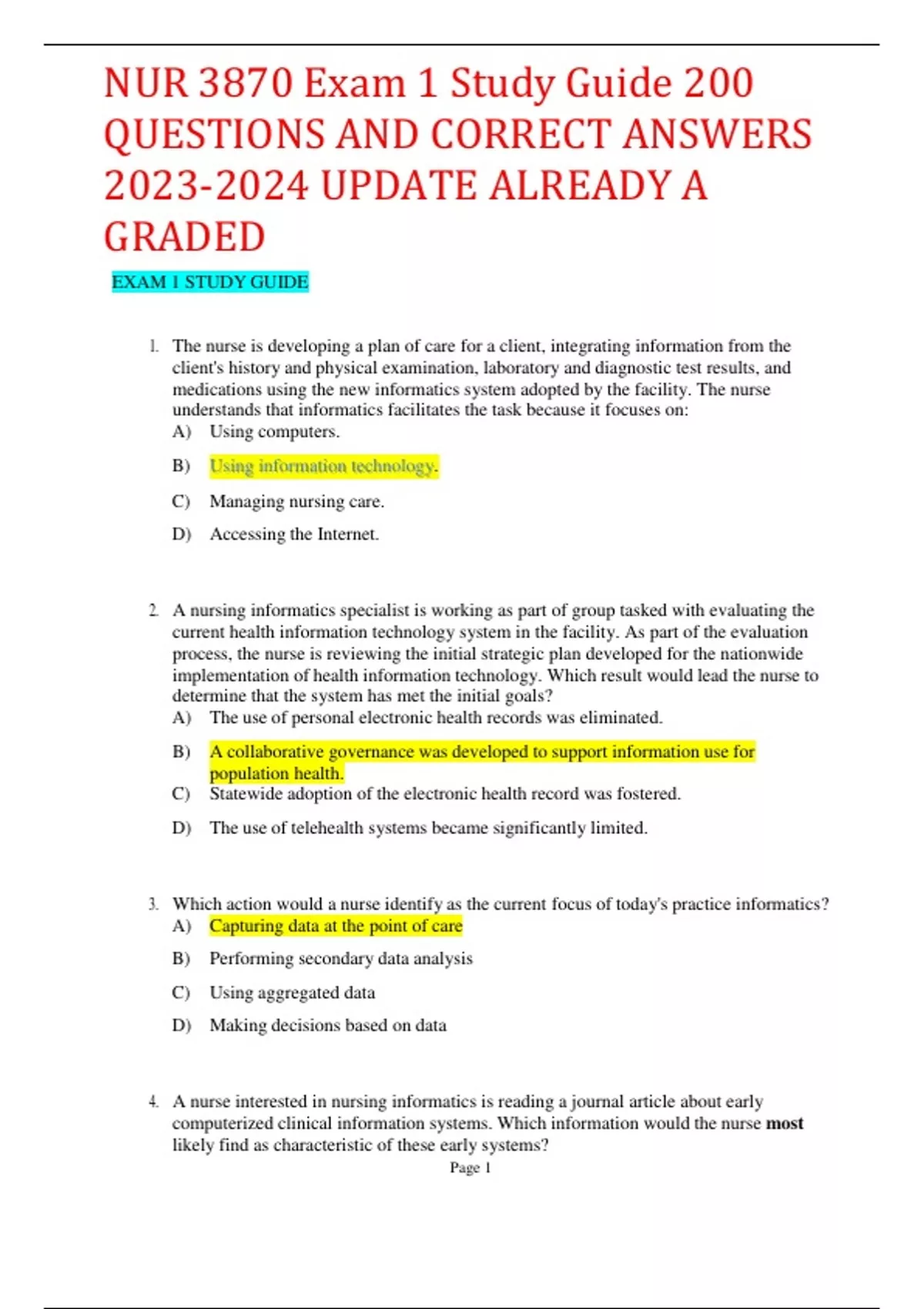 NUR 3870 Exam 1 Study Guide 200 QUESTIONS AND CORRECT ANSWERS UPDATE ALREADY A GRADED