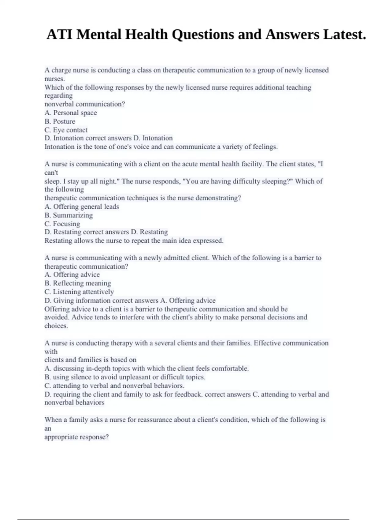 ATI Mental Health Questions and Answers Latest. A charge nurse is conducting a class on therapeutic communication to a group of newly licensed nurses. Which of the following responses by the newly licensed nurse requires additional teaching regarding nonverbal communication? A. Personal space B. Posture C. Eye contact D. Intonation correct answers D. Intonation Intonation is the tone of one's voice and can communicate a variety of feelings. A nurse is communicating with a client on the acute mental health facility. The client states, "I can't sleep. I stay up all night." The nurse responds, "You are having difficulty sleeping?" Which of the following therapeutic communication techniques is the nurse demonstrating? A. Offering general leads B. Summarizing C. Focusing D. Restating correct answers D. Restating Restating allows the nurse to repeat the main idea expressed. A nurse is communicating with a newly admitted client. Which of the following is a barrier to therapeutic communication? A. Offering advice B. Reflecting meaning C. Listening attentively D. Giving information correct answers A. Offering advice Offering advice to a client is a barrier to therapeutic communication and should be avoided. Advice tends to interfere with the client's ability to make personal decisions and choices. A nurse is conducting therapy with a several clients and their families. Effective communication with clients and families is based on A. discussing in-depth topics with which the client feels comfortable. B. using silence to avoid unpleasant or difficult topics. C. attending to verbal and nonverbal behaviors. D. requiring the client and family to ask for feedback. correct answers C. attending to verbal and nonverbal behaviors When a family asks a nurse for reassurance about a client's condition, which of the following is an appropriate response? ATI Mental Health Questions and Answers Latest. A. "I think your son is getting better. What have you noticed?" B. "I'm sure everything will be okay. It just takes time to heal." C. "I'm not sure what's wrong. Have you asked the doctor about your concerns?" D. "I understand you're concerned. Let's discuss what concerns you specifically." correct answers D. "I understand you're concerned. Let's discuss what concerns you specifically." A therapeutic response reflects upon, and accepts, the family's feelings, and it allows the members to clarify what they are feeling. A nurse is caring for a client who smokes and has lung cancer. The client reports, "I'm coughing because I have that cold that everyone has been getting." Which of the following defense mechanisms is the client using? A. Reaction formation B. Denial C. Displacement D. Sublimation correct answers B. Denial pretending the truth is not reality to manage the anxiety of acknowledging what is real. A nurse is obtaining informed consent for a client who has just learned she must have a breast biopsy. The client is perspiring and pale, has a respiratory rate 30/min, and says, "I don't quite understand what you're trying to tell me." The nurse should assess the client's anxiety as which of the following? A. Mild B. Moderate C. Severe D. Panic correct answers B. Moderate Moderate anxiety decreases problem-solving and may hamper one's ability to understand information. Vital signs may increase somewhat, and the person is visibly anxious. A nurse is caring for a client who is experiencing moderate anxiety. Which of the following is an appropriate nursing intervention when trying to give necessary information to the client? A. Reassure the client that everything will be okay. B. Use a low-pitched voice and speak slowly. C. Ignore the client's anxiety so that she will not be embarrassed. D. Demonstrate a calm manner while using simple and clear language. correct answers D. Demonstrate a calm manner while using simple and clear language. giving information simply and calmly will help the client grasp essential facts. A nurse is talking with a client who is at risk for suicide following the death of his spouse. Which of the following statements by the nurse is appropriate? A. "I feel very sorry for the loneliness you must be experiencing." B. "Suicide is not the appropriate way to cope with loss." C. "Losing someone close to you must be very upsetting." D. "I know how difficult it is to lose a loved one." correct answers C. "Losing someone close to you must be very upsetting." This statement is an empathetic response that attempts to understand the client's feelings. A nurse is in the working phase of a therapeutic relationship with a client who has methamphetamine use disorder. Which of the following indicates transference behavior? A. The client asks the nurse whether she will go out to dinner with him. B. The client accuses the nurse of telling him what to do just like his ex-girlfriend. C. The client reminds the nurse of a friend who died from a substance overdose. D. The client becomes angry and threatens harm to himself. correct answers B. The client accuses the nurse of telling him what to do just like his ex-girlfriend. When a client views the nurse as having characteristics of another person who has been significant to his personal life, such as his ex-girlfriend, this indicates transference. A charge nurse is discussing the characteristics of a nurse-client relationship with a newly licensed nurse. Which of the following are appropriate to include in the discussion? (Select all that apply.) A. The needs of both participants are met. B. An emotional commitment exists between the participants. C. It is goal-directed. D. Behavioral change is encouraged. E. A termination date is established. correct answers C. It is goal-directed. D. Behavioral change is encouraged. E. A termination date is established. A nurse is planning care for the termination phase of a nurse-client relationship. Which of the following actions is appropriate to include in the plan of care? A. Discussing ways to use new behaviors B. Practi