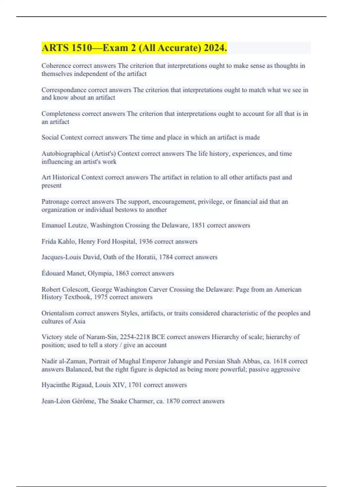 Coherence correct answers The criterion that interpretations ought to make sense as thoughts in themselves independent of the artifact Correspondance correct answers The criterion that interpretations ought to match what we see in and know about an artifact Completeness correct answers The criterion that interpretations ought to account for all that is in an artifact Social Context correct answers The time and place in which an artifact is made Autobiographical (Artist's) Context correct answers The life history, experiences, and time influencing an artist's work Art Historical Context correct answers The artifact in relation to all other artifacts past and present Patronage correct answers The support, encouragement, privilege, or financial aid that an organization or individual bestows to another Emanuel Leutze, Washington Crossing the Delaware, 1851 correct answers Frida Kahlo, Henry Ford Hospital, 1936 correct answers Jacques-Louis David, Oath of the Horatii, 1784 correct answers Édouard Manet, Olympia, 1863 correct answers Robert Colescott, George Washington Carver Crossing the Delaware: Page from an American History Textbook, 1975 correct answers Orientalism correct answers Styles, artifacts, or traits considered characteristic of the peoples and cultures of Asia Victory stele of Naram-Sin, BCE correct answers Hierarchy of scale; hierarchy of position; used to tell a story / give an account Nadir al-Zaman, Portrait of Mughal Emperor Jahangir and Persian Shah Abbas, ca. 1618 correct answers Balanced, but the right figure is depicted as being more powerful; passive aggressive Hyacinthe Rigaud, Louis XIV, 1701 correct answers Jean-Léon Gérôme, The Snake Charmer, ca. 1870 correct answers