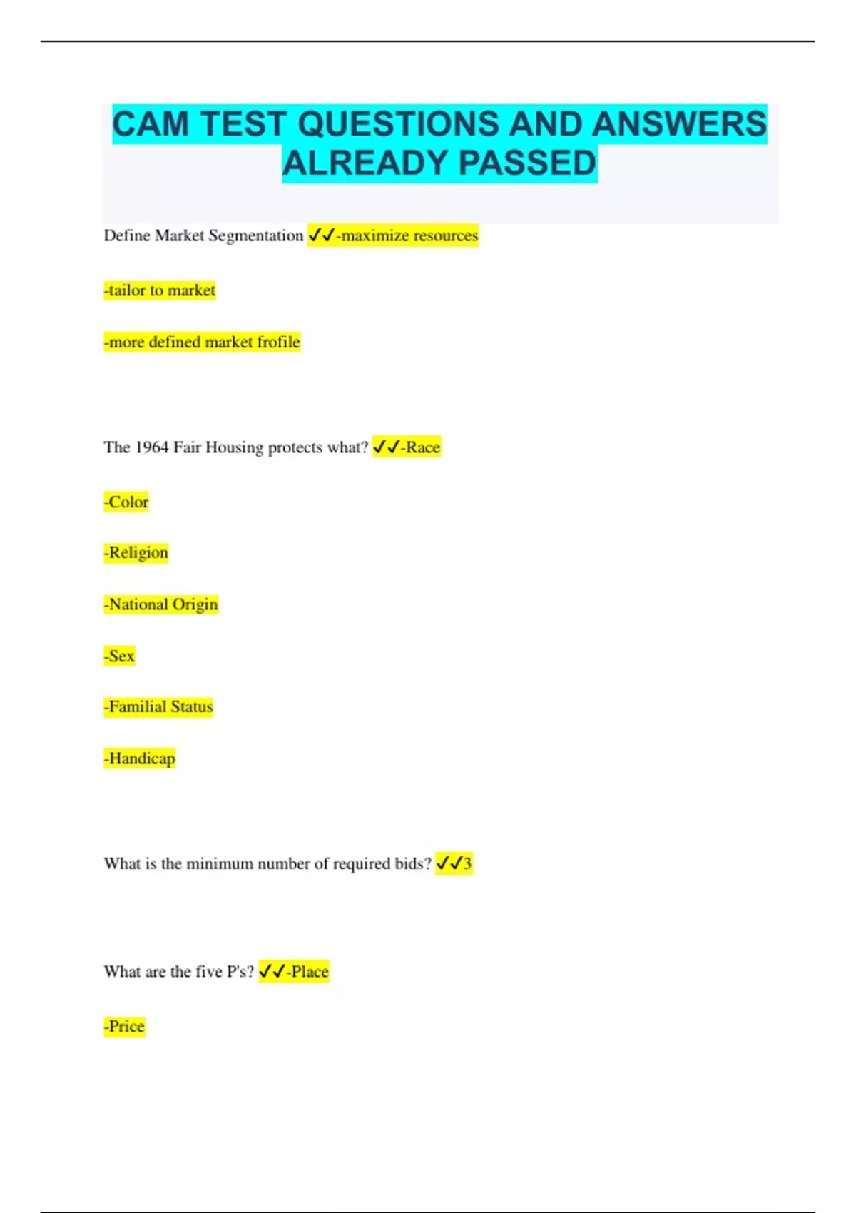 CAM TEST QUESTIONS AND ANSWERS ALREADY PASSED Define Market Segmentation -maximize resources -tailor to market -more defined market frofile The 1964 Fair Housing protects what? -Race -Color -Religion -National Origin -Sex -Familial Status -Handicap What is the minimum number of required bids? 3 What are the five P's? -Place -Price -Product -People -Promotion What should be the main focus of an effective incentive program? Job performance True or False: Someone with HIV is a protected class. True ADA provision to title III is what? ADA- leasing office area must meet requirements What is HOPA? HOPA eliminates the requirement that 55 and older have significant facilities and servicing designed for elderly. What year was HOPA established? 1995 What did the 1988 Act add? -Familial Status -Individual with disabilities Qualifying for modification requires? -Oral or written request -verification (if obvious- none are required) If not obvious verification required Who can verify accomodations for modifications? -Doctor, or medical professor -Third Party case worker -Therapist True or False: Someone addicted to drugs is a protected class False Valid proof of income? -most recent pay stub -previous years W2 -Three months worth of bank statements What are reserve accrual for? Future large cap X improvements Name 3 examples of vendors that require a license? -Elevator -Swimming Pool -A/C What is an example of a fixed expense? Taxes Define steering? Trying to encourage prospects to lease at a specific location based on race, marital status or age. Ways to meet OSHA guidelines? -monthly safety meetings -provide healthy and safe work environment -file and keep all documentation of safety meetings True or False: Insurance is an example of operating expense True What is GPR? current rent at 100% occupied What is the purpose of preventative maintenance? Lessen the likelihood of future maintenance problems What does exposure incident involve? Blood or Bodily Fluids What two forms of payments can be accepted for rent? Check or Money Order What are reasons to fire a vendor? -Conflict of interest -Non