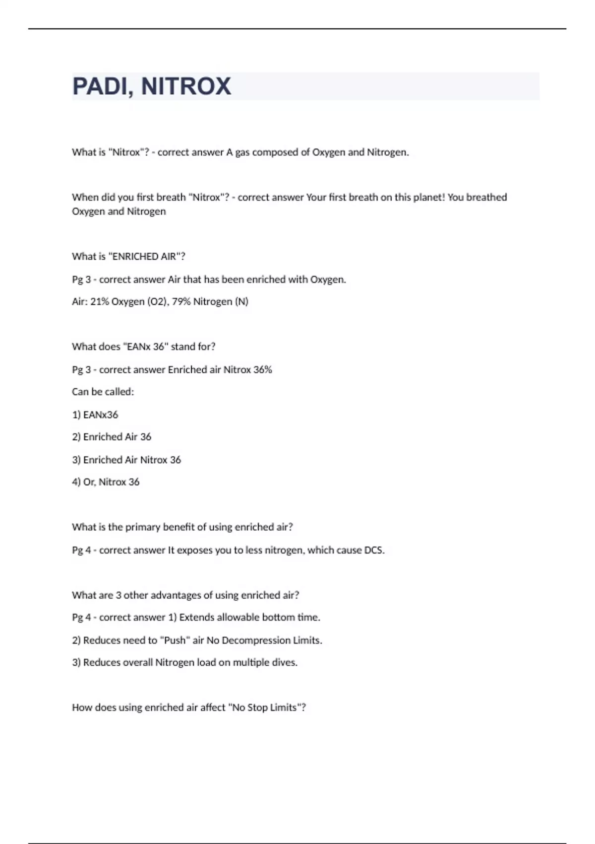 PADI, NITROXWhat is "Nitrox"? - correct answer A gas composed of Oxygen and Nitrogen. When did you first breath "Nitrox"? - correct answer Your first breath on this planet! You breathed Oxygen and Nitrogen What is "ENRICHED AIR"? Pg 3 - correct answer Air that has been enriched with Oxygen. Air: 21% Oxygen (O2), 79% Nitrogen (N) What does "EANx 36" stand for? Pg 3 - correct answer Enriched air Nitrox 36% Can be called: 1) EANx36 2) Enriched Air 36 3) Enriched Air Nitrox 36 4) Or, Nitrox 36 What is the primary benefit of using enriched air? Pg 4 - correct answer It exposes you to less nitrogen, which cause DCS. What are 3 other advantages of using enriched air? Pg 4 - correct answer 1) Extends allowable bottom time. 2) Reduces need to "Push" air No Decompression Limits. 3) Reduces overall Nitrogen load on multiple dives. How does using enriched air affect "No Stop Limits"? Pg 4 - correct answer Longer "No Decompression Limits. Less Nitrogen in body. Body metabolizes the extra O2. How does using an "Enriched Air Computer" affect your "No Stop Limits"? Pg 4 - correct answer Used with "Enriched Air Computer" you have even longer No Stop Limits. Why is it wrong to say, "enriched air is safer than air when diving well within Air No Decompression limits"? Pg 4 - correct answer You increase your O2 exposure which can be SIGNIFICANTLY more hazardous than Nitrogen problems. How does using enriched air affect NARCOSIS when diving? Pg 5 - correct answer NO DIFFERANCE Theoretiaclly O2 has about the same Narcotic potential as Nitrogen. What are 3 advantages of using an enriched air dive computer for enriched air diving? Pg 5 - correct answer 1) More "No Stop Time" with multiple dives. 2) Alerts you if you exceed Max depth for your blend. 3) Simplify planning & execution while warning you near limits. What is the primary concern reguarding enriched air and SCUBA eguipment? Pg 7 - correct answer High O2 content: 1) Some material may burn or explode. 2) Also may cause rapid deterioration. (Oxidation) What are the requirments and recommendations for SCUBA eguipment used with enriched air with up to 40% O2. Pg 7 - correct answer No answer at this time go look up Why does enriched air diving require a dedicated cylinder? 2 reasons