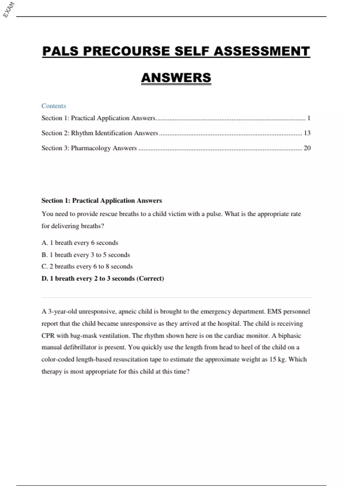 This document provides the complete answer key for the Pediatric Advanced Life Support (PALS) Precourse Self-Assessment, based on AHA guidelines. It includes detailed solutions and correct responses for all sections: practical application, rhythm identification, and pharmacology. Each question covers essential pediatric emergency scenarios such as CPR ratios, defibrillation energy doses, medication dosages, rhythm recognition, and treatment protocols. Ideal for healthcare professionals and students preparing for the official PALS certification or renewal course.