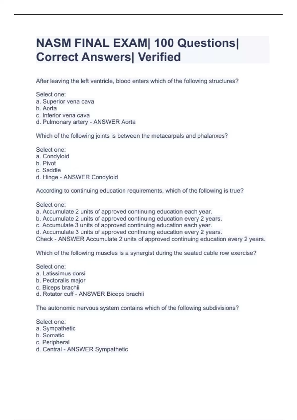 After leaving the left ventricle, blood enters which of the following structures? Select one: a. Superior vena cava b. Aorta c. Inferior vena cava d. Pulmonary artery - ANSWER Aorta Which of the following joints is between the metacarpals and phalanxes? Select one: a. Condyloid b. Pivot c. Saddle d. Hinge - ANSWER Condyloid According to continuing education requirements, which of the following is true? Select one: a. Accumulate 2 units of approved continuing education each year. b. Accumulate 2 units of approved continuing education every 2 years. c. Accumulate 3 units of approved continuing education each year. d. Accumulate 3 units of approved continuing education every 2 years. Check - ANSWER Accumulate 2 units of approved continuing education every 2 years. Which of the following muscles is a synergist during the seated cable row exercise? Select one: a. Latissimus dorsi b. Pectoralis major c. Biceps brachii d. Rotator cuff - ANSWER Biceps brachii The autonomic nervous system contains which of the following subdivisions? Select one: a. Sympathetic b. Somatic c. Peripheral d. Central - ANSWER Sympathetic