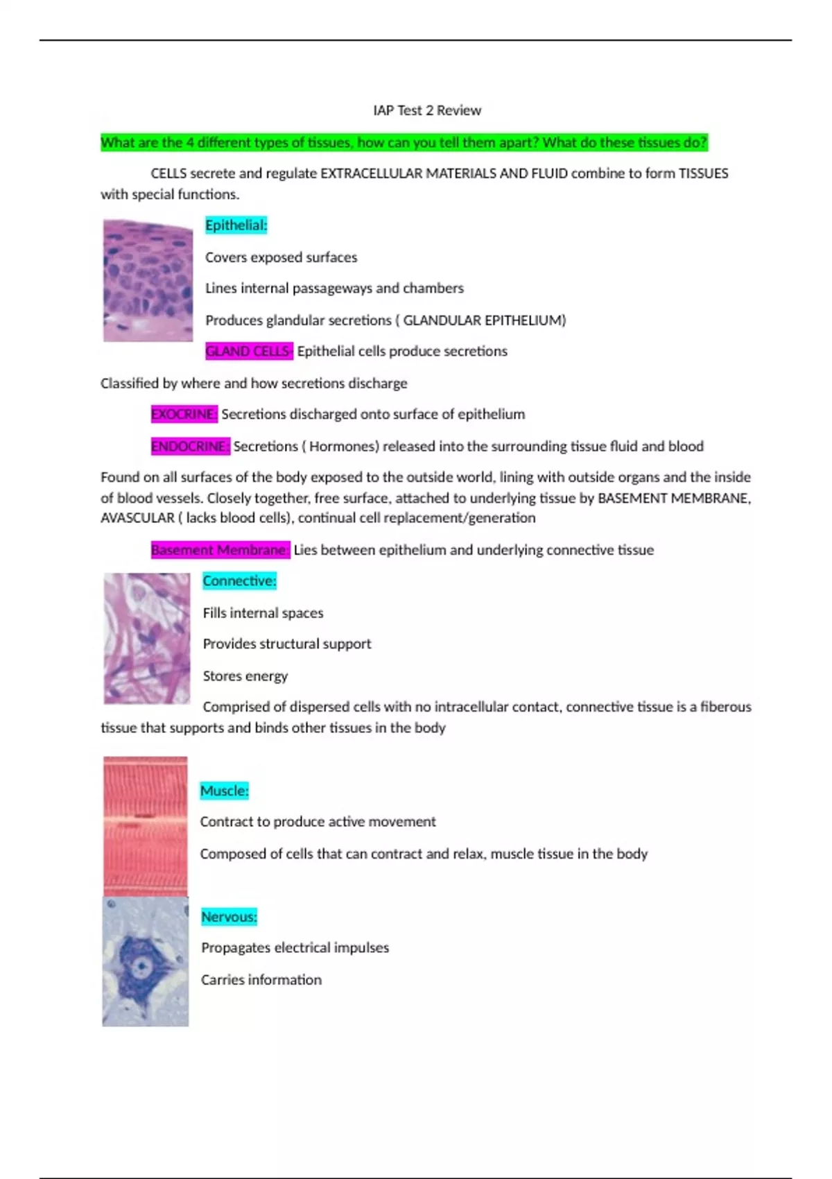 This is a review for test 2 of Introduction to Anatomy and Physiology. It includes chapter 4- tissues and chapter 5- integumentary system.