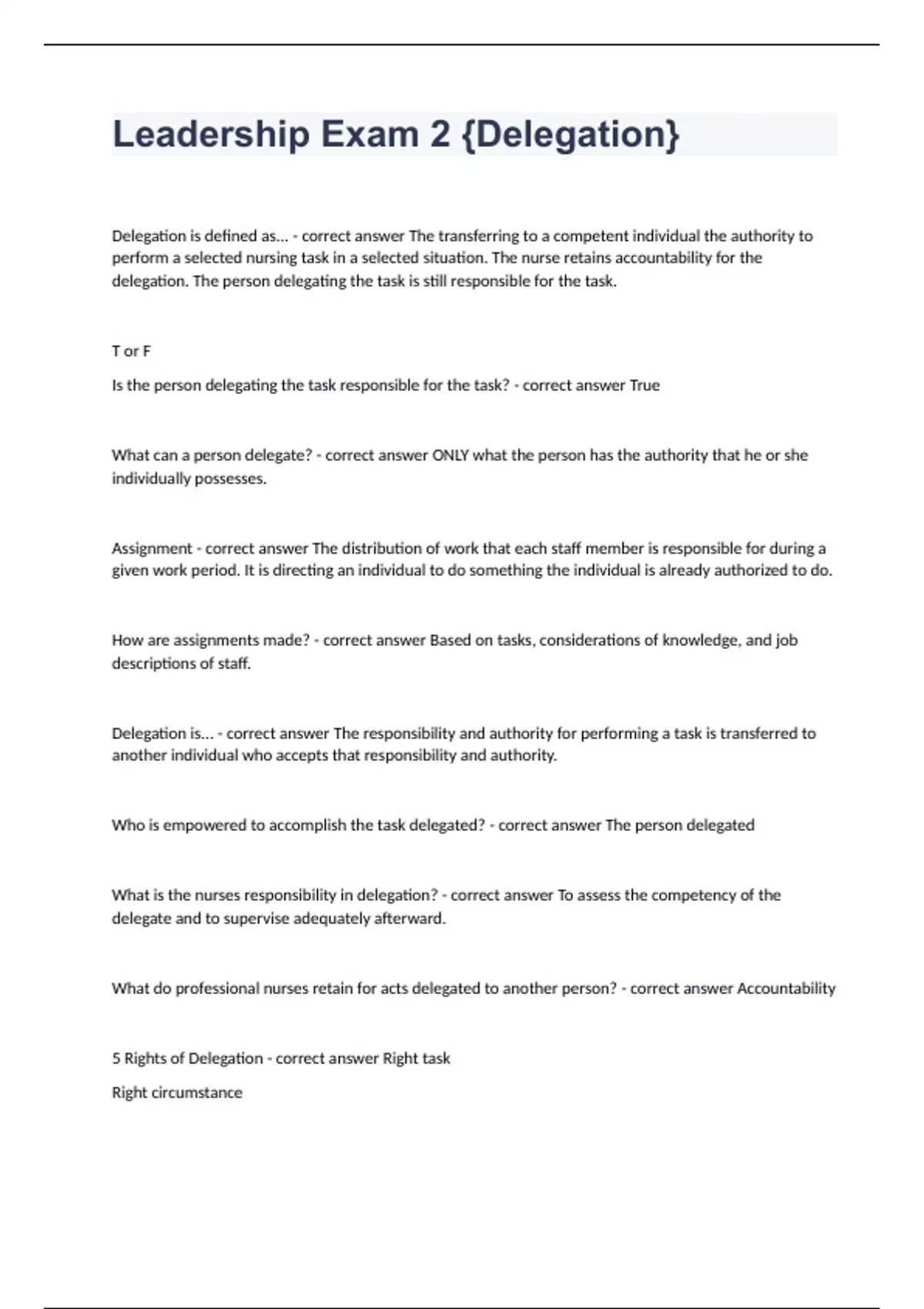 Leadership Exam 2 {Delegation}questions correctly answered rated A+