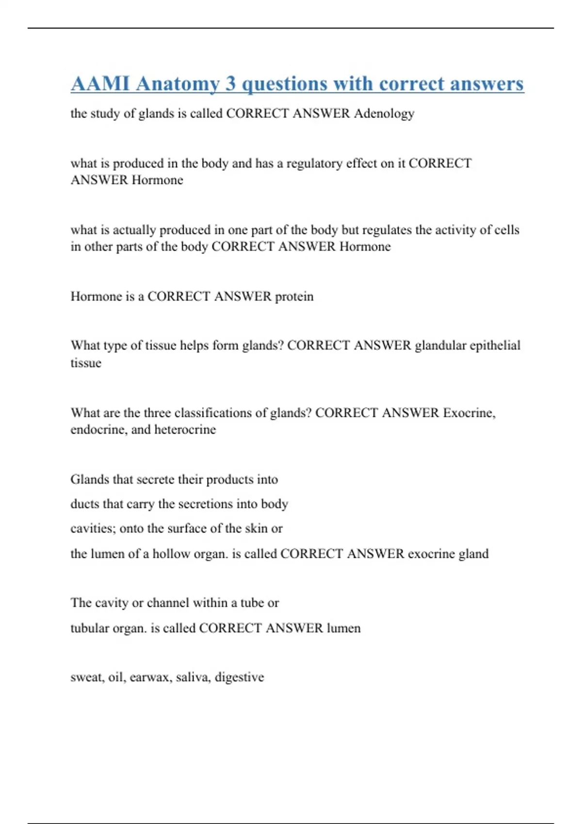 the study of glands is called CORRECT ANSWER Adenology what is produced in the body and has a regulatory effect on it CORRECT ANSWER Hormone what is actually produced in one part of the body but regulates the activity of cells in other parts of the body CORRECT ANSWER Hormone Hormone is a CORRECT ANSWER protein What type of tissue helps form glands? CORRECT ANSWER glandular epithelial tissue What are the three classifications of glands? CORRECT ANSWER Exocrine, endocrine, and heterocrine Glands that secrete their products into ducts that carry the secretions into body cavities; onto the surface of the skin or the lumen of a hollow organ. is called CORRECT ANSWER exocrine gland The cavity or channel within a tube or tubular organ. is called CORREC