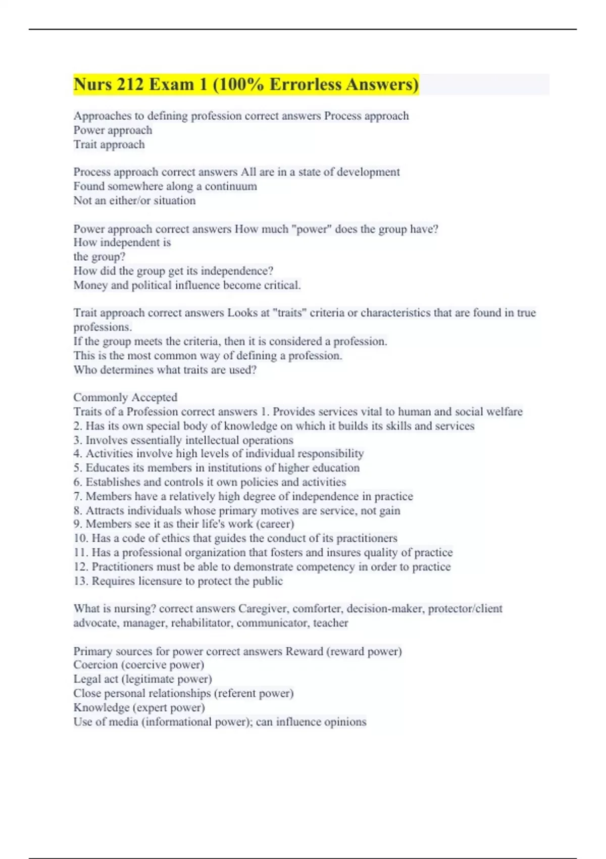 Approaches to defining profession correct answers Process approach Power approach Trait approach Process approach correct answers All are in a state of development Found somewhere along a continuum Not an either/or situation Power approach correct answers How much "power" does the group have? How independent is the group? How did the group get its independence? Money and political influence become critical. Trait approach correct answers Looks at "traits" criteria or characteristics that are found in true professions. If the group meets the criteria, then it is considered a profession. This is the most common way of defining a profession. Who determines what traits are used? Commonly Accepted Traits of a Profession correct answers 1. Provides services vital to human and social welfare 2. Has its own special body of knowledge on which it builds its skills and services 3. Involves essentially intellectual operations 4. Activities involve high levels of individual responsibility 5. Educates its members in institutions of higher education 6. Establishes and controls it own policies and activities 7. Members have a relatively high degree of independence in practice 8. Attracts individuals whose primary motives are service, not gain 9. Members see it as their life's work (career) 10. Has a code of ethics that guides the conduct of its practitioners 11. Has a professional organization that fosters and insures quality of practice 12. Practitioners must be able to demonstrate competency in order to practice 13. Requires licensure to protect the public What is nursing? correct answers Caregiver, comforter, decision-maker, protector/client advocate, manager, rehabilitator, communicator, teacher Primary sources for power correct answers Reward (reward power) Coercion (coercive power) Legal act (legitimate power) Close personal relationships (referent power) Knowledge (expert power) Use of media (informational power); can influence opinions