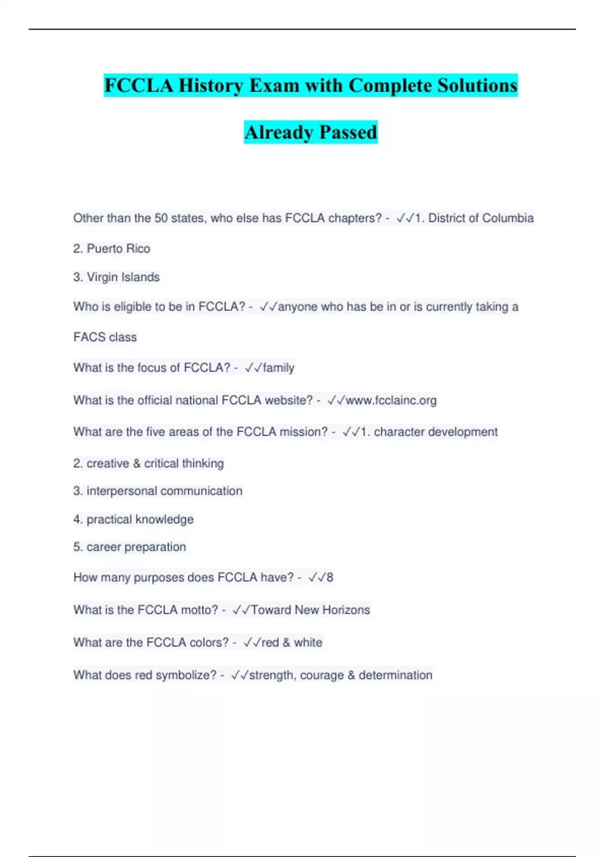 FCCLA History Exam with Complete Solutions Already Passed Other than the 50 states, who else has FCCLA chapters? - 1. District of Columbia 2. Puerto Rico 3. Virgin Islands Who is eligible to be in FCCLA? - anyone who has be in or is currently taking a FACS class What is the focus of FCCLA? - family What is the official national FCCLA website? - What are the five areas of the FCCLA mission? - 1. character development 2. creative & critical thinking 3. interpersonal communication 4. practical knowledge 5. career preparation How many purposes does FCCLA have? - 8 What is the FCCLA motto? - Toward New Horizons What are the FCCLA colors? - red & white What does red symbolize? - strength,
