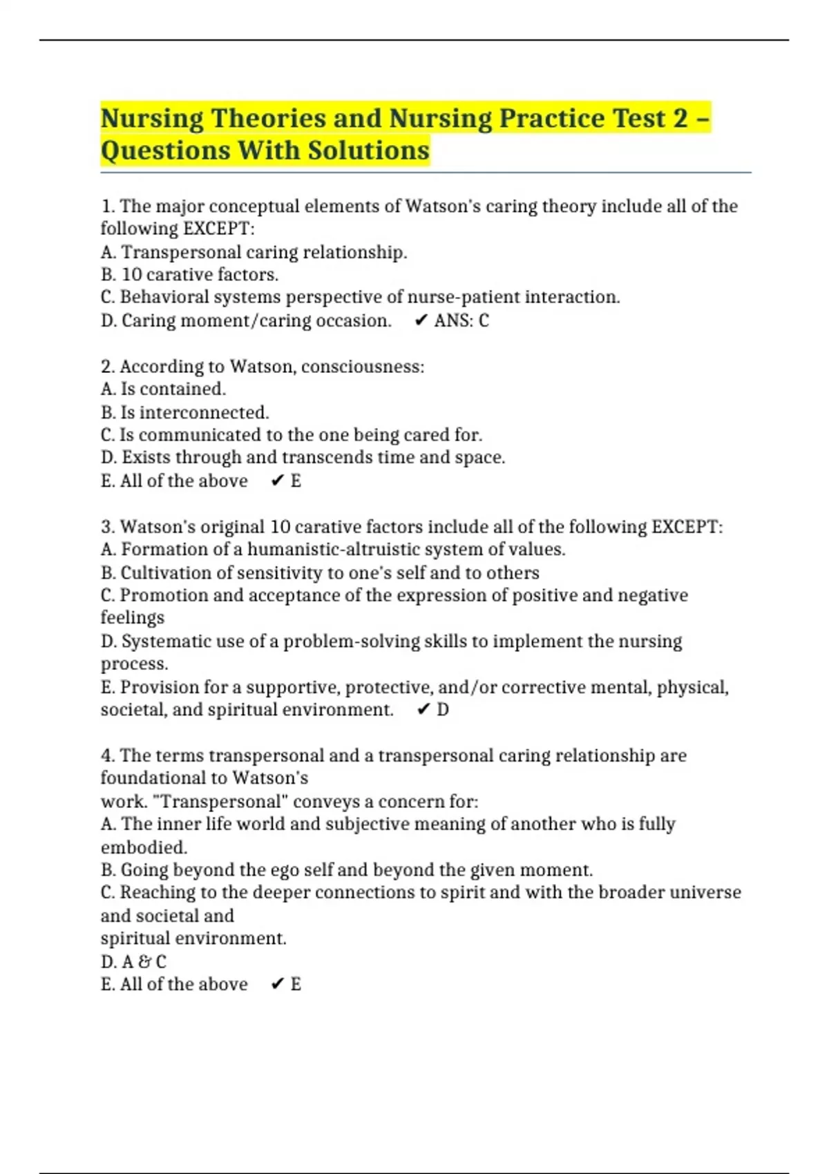 1. The major conceptual elements of Watson's caring theory include all of the