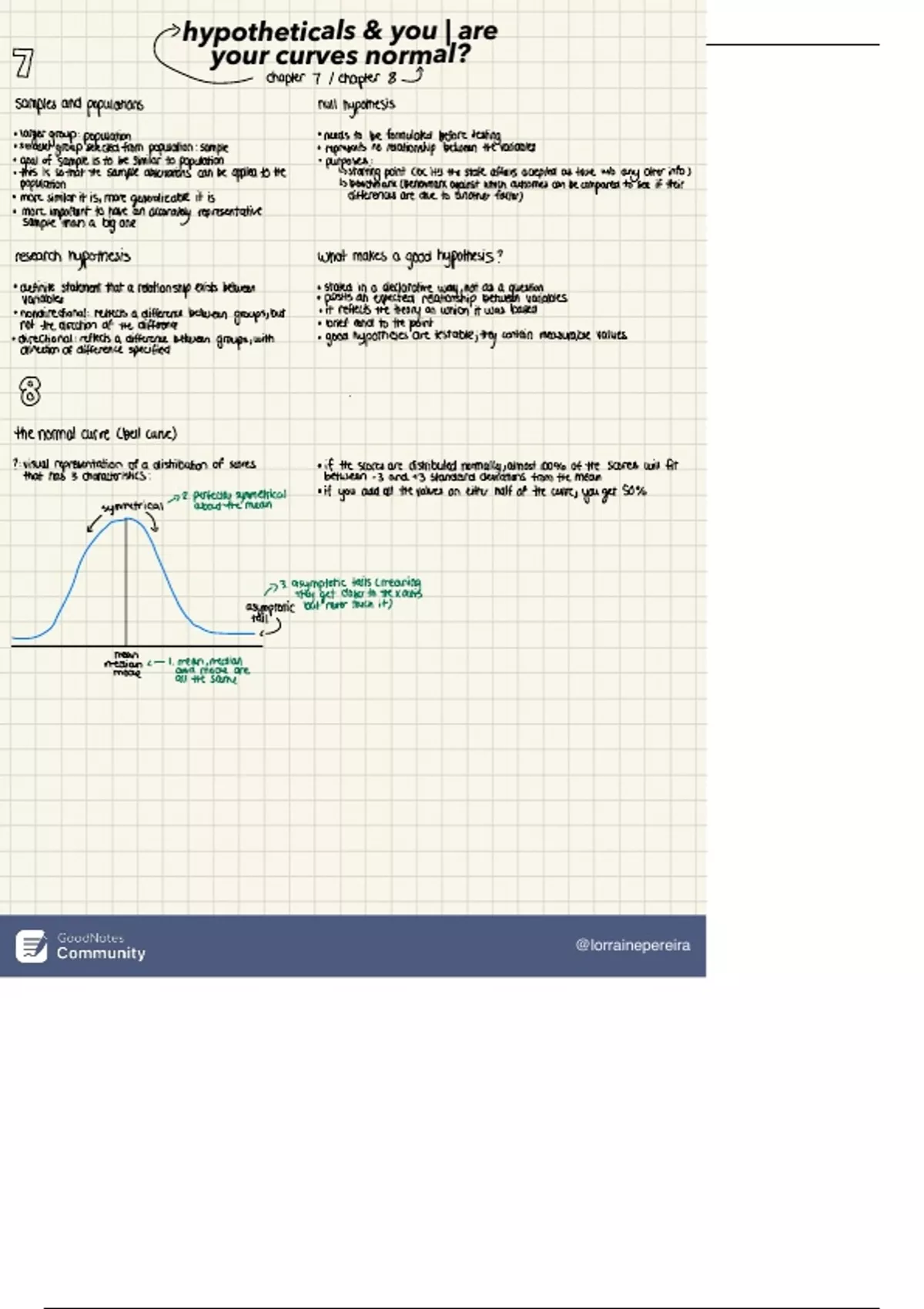 Defining a population vs a sample. What a null hypothesis is. What a research hypothesis is and what makes a good one. Characteristics of a normal bell curve.