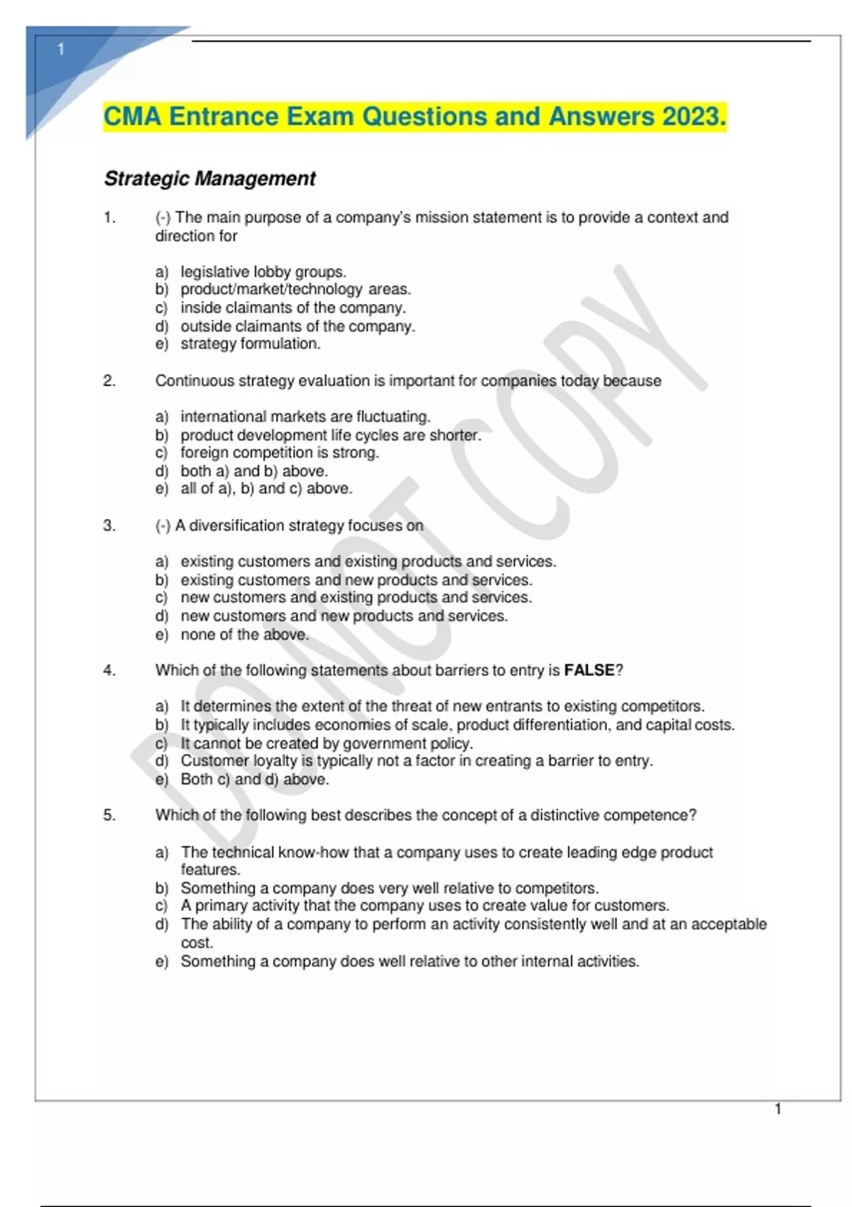 1. (-) The main purpose of a company’s mission statement is to provide a context and