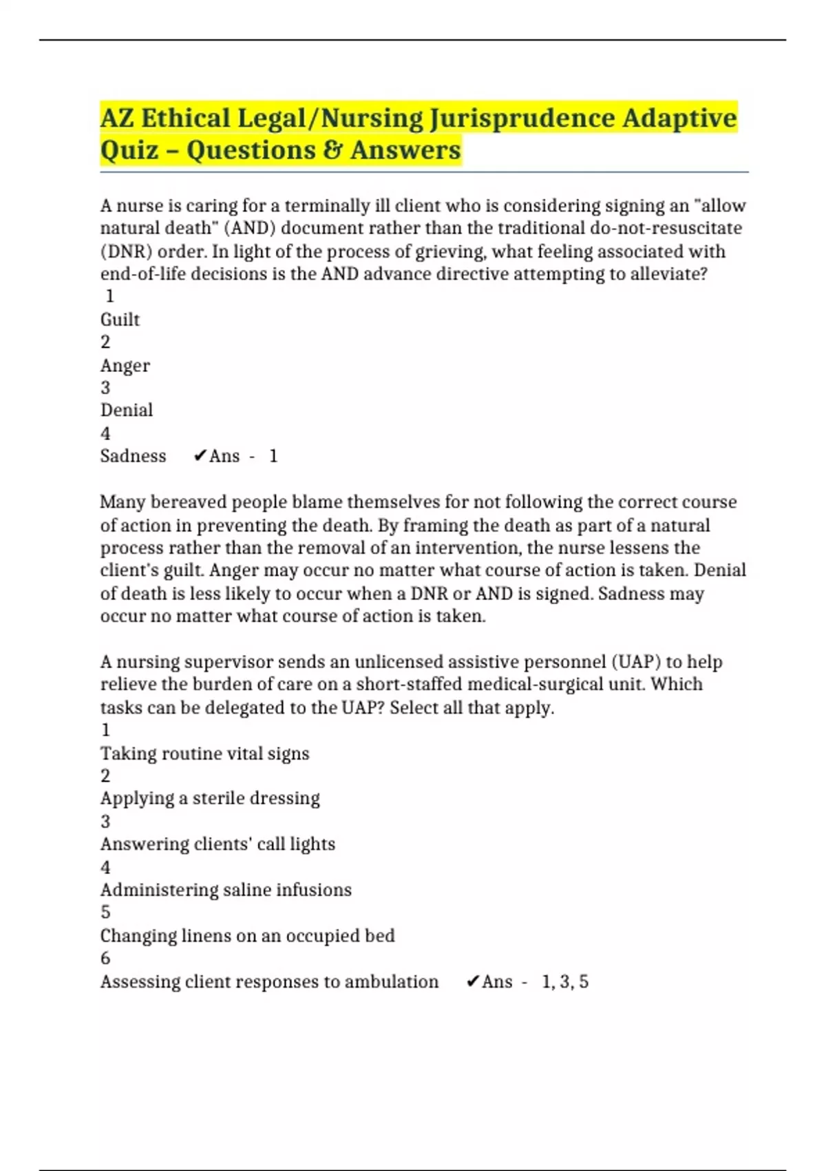 AZ Ethical Legal/Nursing Jurisprudence Adaptive Quiz – Questions & Answers