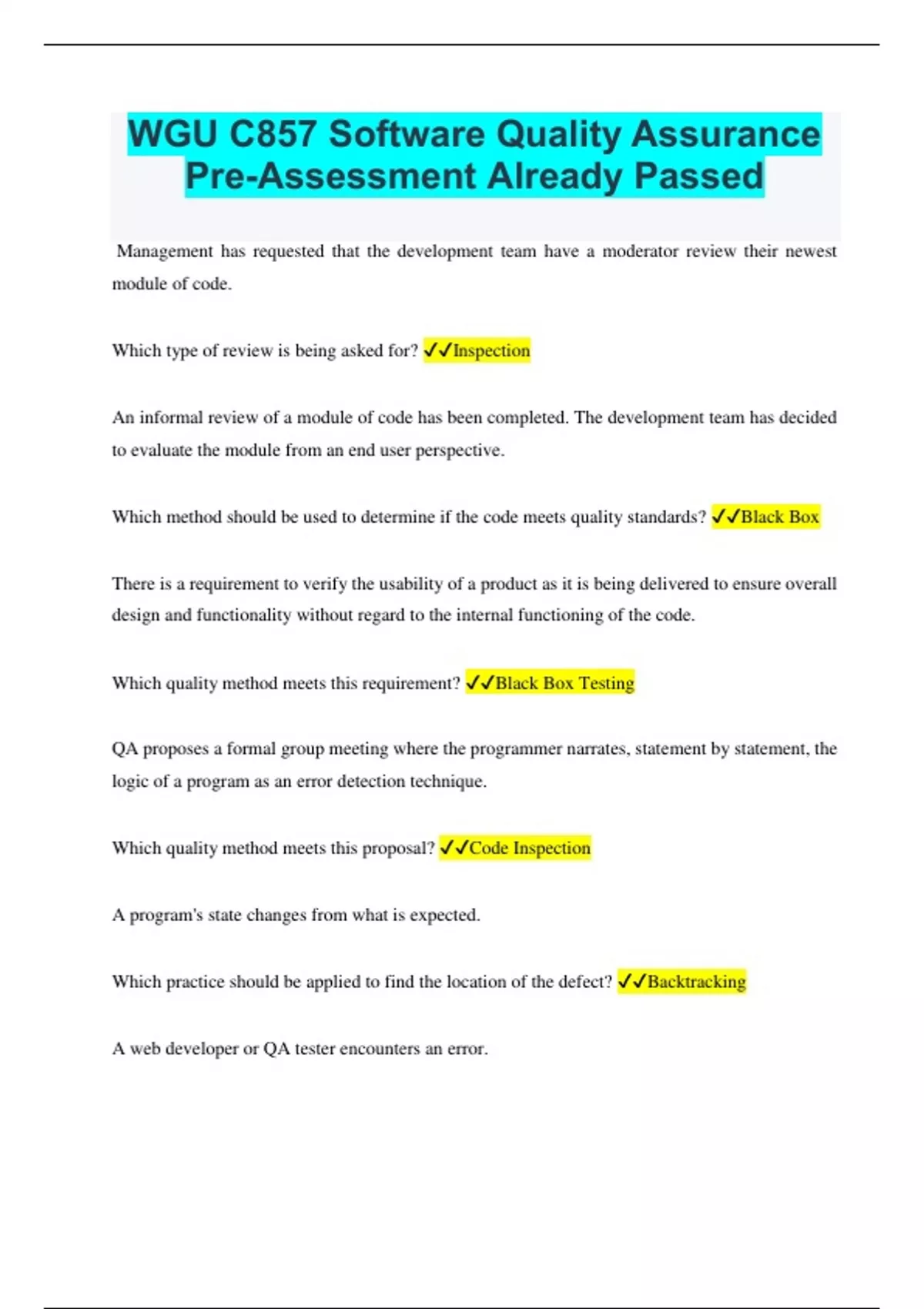 WGU C857 Software Quality Assurance Pre-Assessment Already Passed Management has requested that the development team have a moderator review their newest module of code. Which type of review is being asked for? Inspection An informal review of a module of code has been completed. The development team has decided to evaluate the module from an end user perspective. Which method should be used to determine if the code meets quality standards? Black Box There is a requirement to verify the usability of a product as it is being delivered to ensure overall design and functionality without regard to the internal functioning of the code. Which quality method meets this requirement? Black Box Testing QA proposes a formal group meeting where the programmer narrates, statement by statement, the logic of a program as an error detection technique. Which quality method meets this proposal? Code Inspection A program's state changes from what is expected. Which practice should be applied to find the location of the defect? Backtracking A web developer or QA tester encounters an error.
