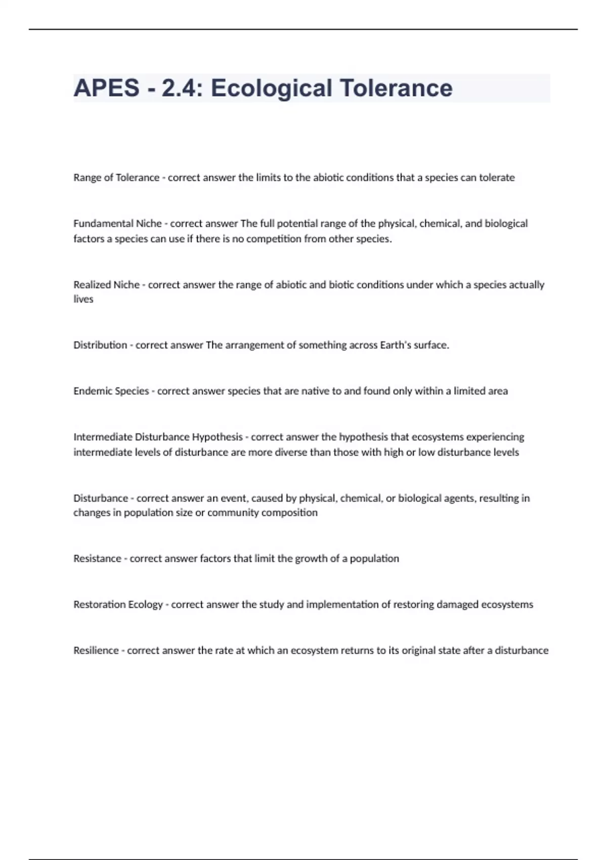 APES - 2.4 Ecological Tolerance Questions with complete solution 2023/2024Range of Tolerance - correct answer the limits to the abiotic conditions that a species can tolerate Fundamental Niche - correct answer The full potential range of the physical, chemical, and biological factors a species can use if there is no competition from other species. Realized Niche - correct answer the range of abiotic and biotic conditions under which a species actually lives Distribution - correct answer The arrangement of something across Earth's surface. Endemic Specie