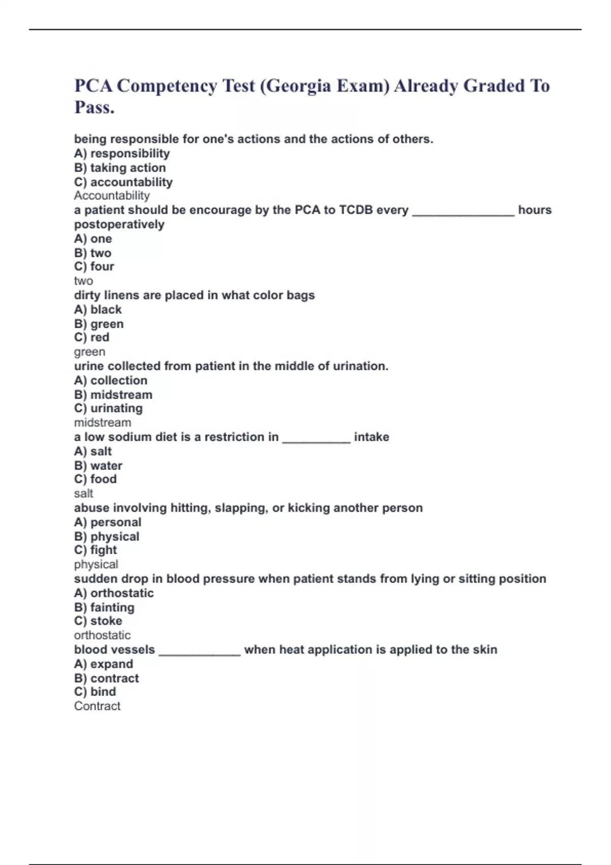 PCA Competency Test (Georgia Exam) Already Graded To Pass. being responsible for one's actions and the actions of others. A) responsibility B) taking action C) accountability Accountability a patient should be encourage by the PCA to TCDB every _______________ hours postoperatively A) one B) two C) four two dirty linens are placed in what color bags A) black B) green C) red green urine collected from patient in the middle of urination. A) collection B) midstream C) urinating midstream a low sodium diet is a restriction in __________ intake A) salt B) water C) food salt