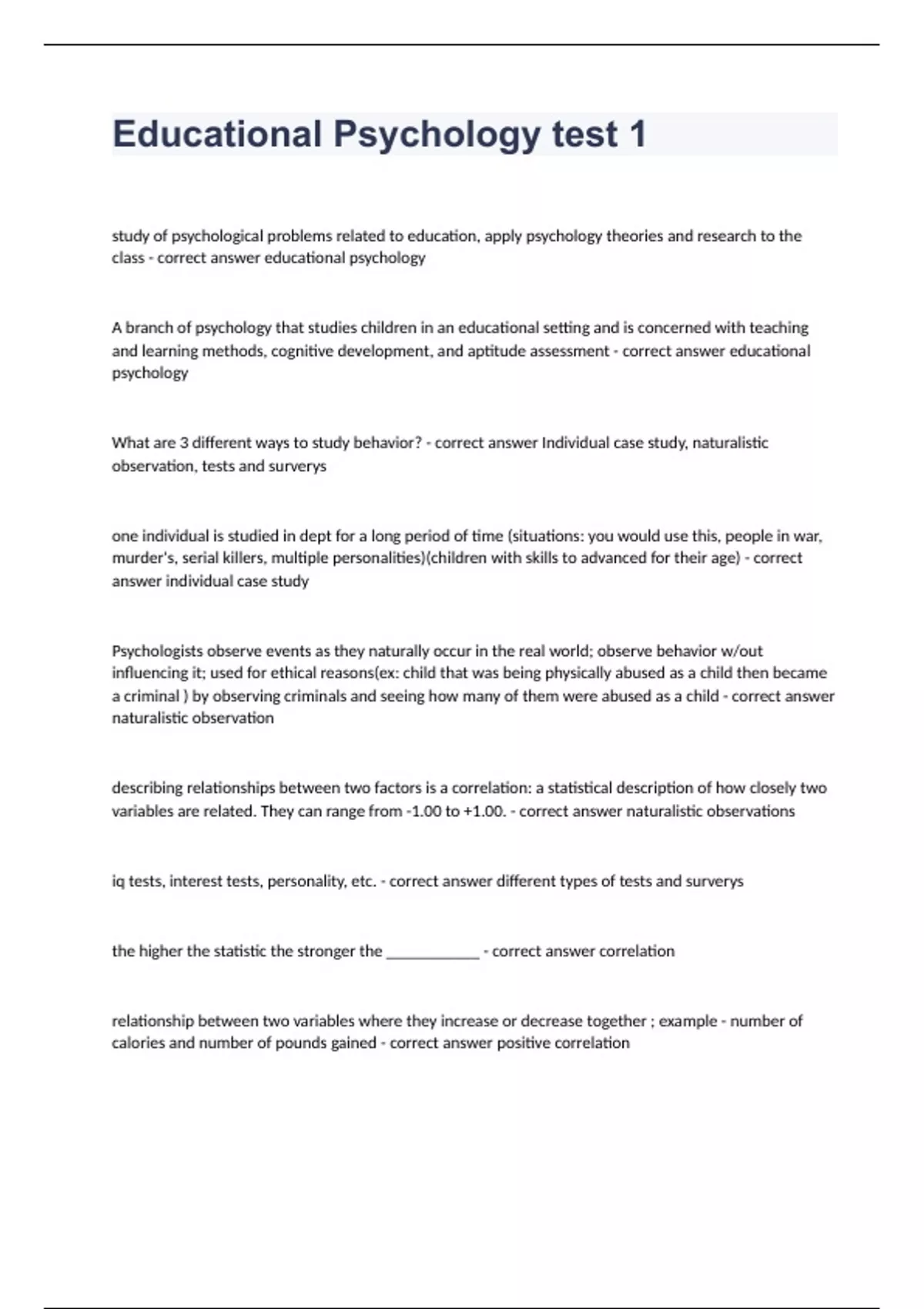 Educational Psychology test 1 Question and answers correctly solved 2023/2024 study of psychological problems related to education, apply psychology theories and research to the class - correct answer educational psychology A branch of psychology that studies children in an educational setting and is concerned with teaching and learning methods, cognitive development, and aptitude assessment - correct answer educational psychology What are 3 different ways to study behavior? - correct answer Individual case study, naturalistic observation, tests and surverys one individual is studied in dept for a long period of time (situations: you would use this, people in war, murder's, serial killers, multiple personalities