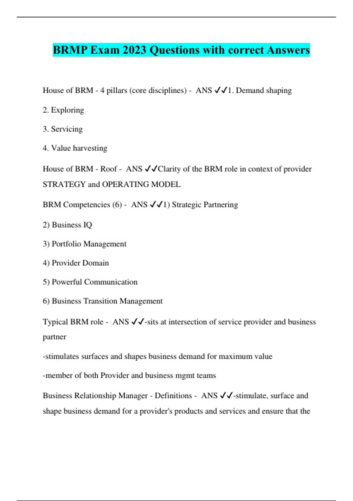 BRMP Exam 2023 Questions with correct Answers House of BRM - 4 pillars (core disciplines) - ANS ️️ 1. Demand shaping 2. Exploring 3. Servicing 4. Value harvesting House of BRM - Roof - ANS ️️ Clarity of the BRM role in context of provider STRATEGY and OPERATING MODEL BRM Competencies (6) - ANS ️️ 1) Strategic Partnering 2) Business IQ 3) Portfolio Management 4) Provider Domain 5) Powerful Communication 6) Business Transition Management Typical BRM role - ANS ️️ -sits at intersection of service provider and business partner -stimulates surfaces and shapes business demand for maximum value -member of both Provider and business mgmt teams Business Relationship Manager - Definitions - ANS ️️ -stimulate, surface and shape business demand for a provider's products and services and ensure that the potential business value from those products and services is captured, optimized and communicate - Role - connector and translator -Discipline and organizational capability - set of competencies and processes that foster productive, value producing relationships between Provider and the business units they serve 3 BRM Metaphors - ANS ️️ 1) Navigator - facilitate business-Provider convergence 2) Connector - facilitate connections and mobilize projects and programs 3) Orchestrator - orchestrate Capabilities to seize value from provider services High Level Capability Model (3) - ANS ️️ 1) Demand Governance Capabilities 2) Value Chain Capabilities 3) Enabling Capabilities Business-Provider Maturity Model - ANS ️️ - Tool for calibrating business demand maturity, provider supply maturity, and the BRM