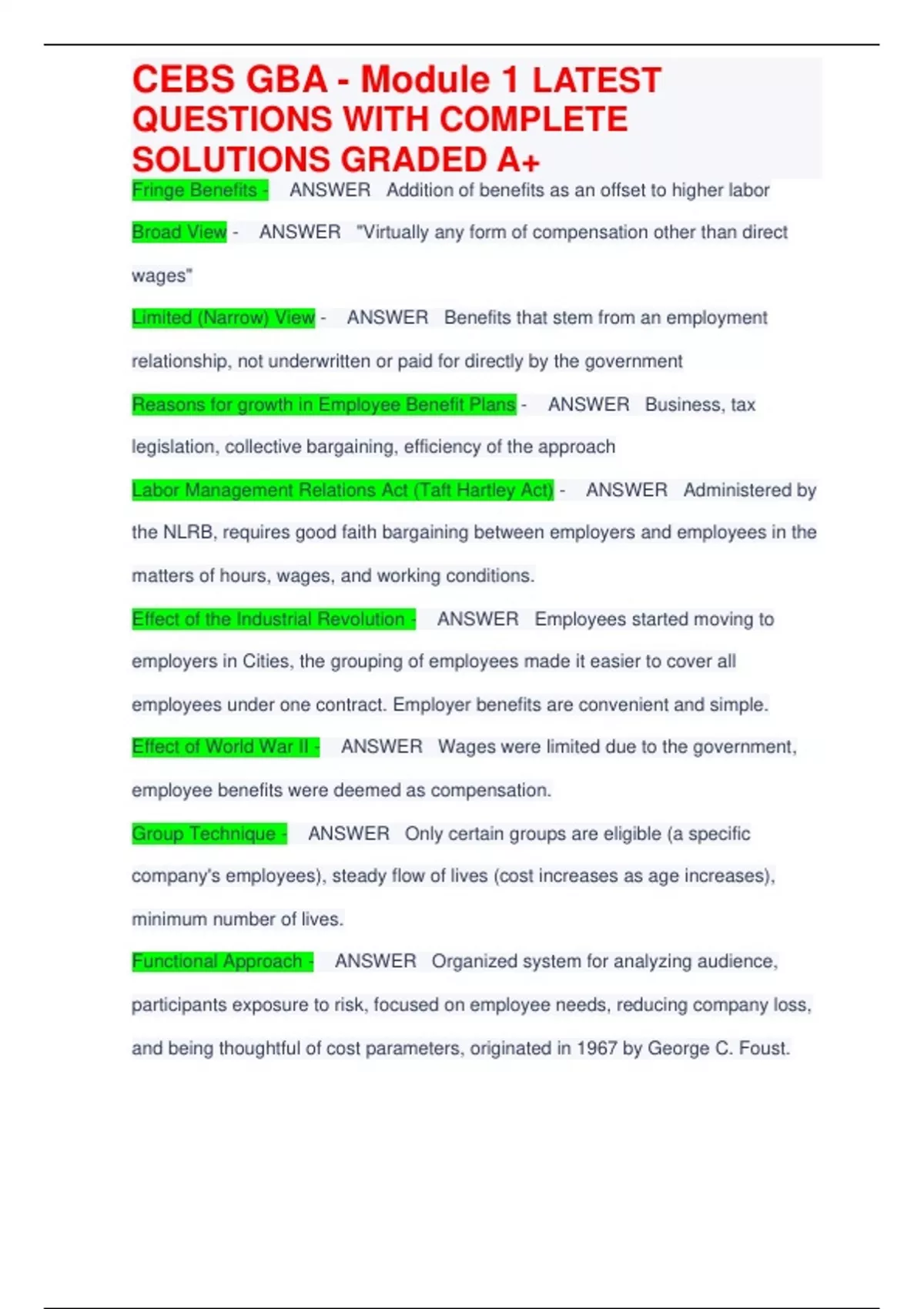 CEBS GBA - Module 1 LATEST QUESTIONS WITH COMPLETE SOLUTIONS GRADED A+ Fringe Benefits - ANSWER Addition of benefits as an offset to higher labor Broad View - ANSWER "Virtually any form of compensation other than direct wages" Limited (Narrow) View - ANSWER Benefits that stem from an employment relationship, not underwritten or paid for directly by the government Reasons for growth in Employee Benefit Plans - ANSWER Business, tax legislation, collective bargaining, efficiency of the approach Labor Management Relations Act (Taft Hartley Act) - ANSWER Administered by the NLRB, requires good faith bargaining between employers and employees in the matters of hours, wages, and working conditions. Effect of the Industrial Revolution - ANSWER Employees started moving to employers in Cities, the grouping of employees made it easier to cover all employees under one contract. Employer benefits are convenient and simple. Effect of World War II - ANSWER Wages were limited due to the government, employee benefits were deemed as compensation. Group Technique - ANSWER Only certain groups are eligible (a specific company's employees), steady flow of lives (cost increases as age increases), minimum number of lives. Functional Approach - ANSWER Organized system for analyzing audience, participants exposure to risk, focused on employee needs, reducing company loss, and being thoughtful of cost parameters, originated in 1967 by George C. Foust. CEBS GBA - Module 1 LATEST QUESTIONS WITH COMPLETE SOLUTIONS GRADED A+ Risk - ANSWER Uncertainty when thinking in terms of a 'loss' (Loss referring to the insurance of a decrease in value). Eg. Illness, death, disability, unemployment, cost of medical bills . Peril - ANSWER The cause of personal/property loss, destruction, or damage. Hazard - ANSWER A condition that increases the probability of a peril occurring or that can increase the loss in the event of a peril. Physical Hazard - ANSWER The presence of flammable materials in absence of extinguishers, machines without safety mechanisms, faulty heating/air conditioner units. Moral Hazard - ANSWER Dishonest, unethical, and immoral people - those who steal/damage company property; file fraudulent medical claims, abuse sick time, falsify pay records or expenses Morale Hazard - ANSWER Those that arise through a person acting careless. It can also include the act of not securing items of value; failing to notify employees of hazards, etc. Pure Risk - ANSWER Either risk will happen, or will not happen. These types of risks can be insured. Eg. sickness, accident, unemployment, disability, theft of property, etc. Speculative Risk - ANSWER Either loss, no loss, or gain. Eg. Purchases of stock, new business ventures, gambling. In each, one could lose, break even, or gain. Personal Risk - ANSWER The most important risk in employee benefits. Includes death, illness, accidents, unemployme