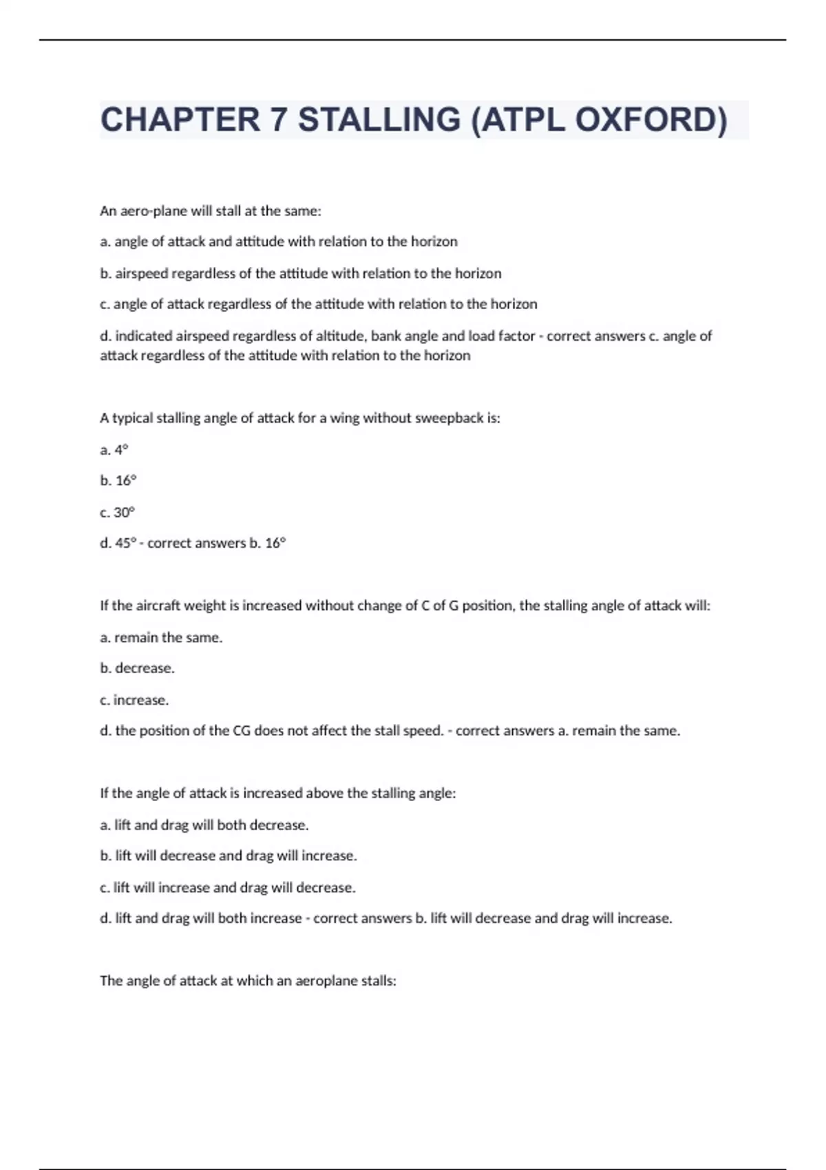 CHAPTER 7 STALLING (ATPL OXFORD)An aero-plane will stall at the same: a. angle of attack and attitude with relation to the horizon b. airspeed regardless of the attitude with relation to the horizon c. angle of attack regardless of the attitude with relation to the horizon d. indicated airspeed regardless of altitude, bank angle and load factor - correct answers c. angle of attack regardless of the attitude with relation to the horizon A typical stalling angle of attack for a wing without sweepback is: a. 4° b. 16° c. 30° d. 45° - correct answers b. 16° If the aircraft weight is increased without change of C of G position, the stalling angle of attack will: a. remain the same. b. decrease. c. increase. d. the position of the CG does not affect the stall speed. - correct answers a. remain the same. If the angle of attack is increased above the stalling angle: a. lift and drag will both decrease. b. lift will decrease and drag will increase. c. lift will increase and drag will decrease. d. lift and drag will both increase - correct answers b. lift will decrease and drag will increase. The angle of attack at which an aeroplane stalls: